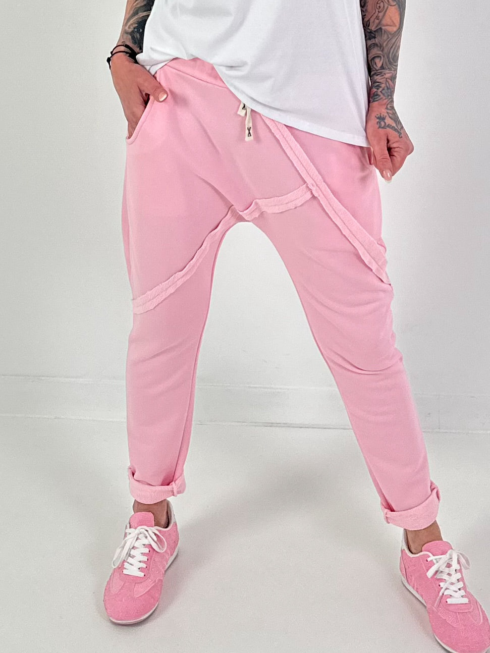Diese lässige Baggy überzeugt durch ihr modernes, detailreiches Design und einen hohen Tragekomfort. Sie ist aus weichem, angenehm fallendem Stoff gefertigt und verfügt über einen elastischen Bund mit Kordelzug zur individuellen Anpassung. Seitlich befinden sich zwei praktische Eingriffstaschen. Auffällig sind die dekorativen, schräg verlaufenden Außennähte bzw. aufgesetzten Stoffbänder auf der Vorderseite, die der Hose einen besonderen, modischen Look verleihen. Das Bein ist locker geschnitten und läuft nach unten schmal zu, was eine lässige, aber dennoch feminine Silhouette schafft. Die Hose ist vielseitig kombinierbar und ideal für entspannte Alltags- oder Loungewear-Outfits.
