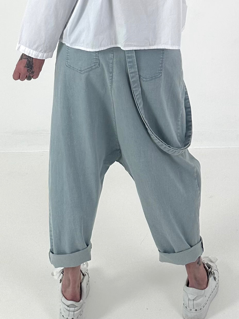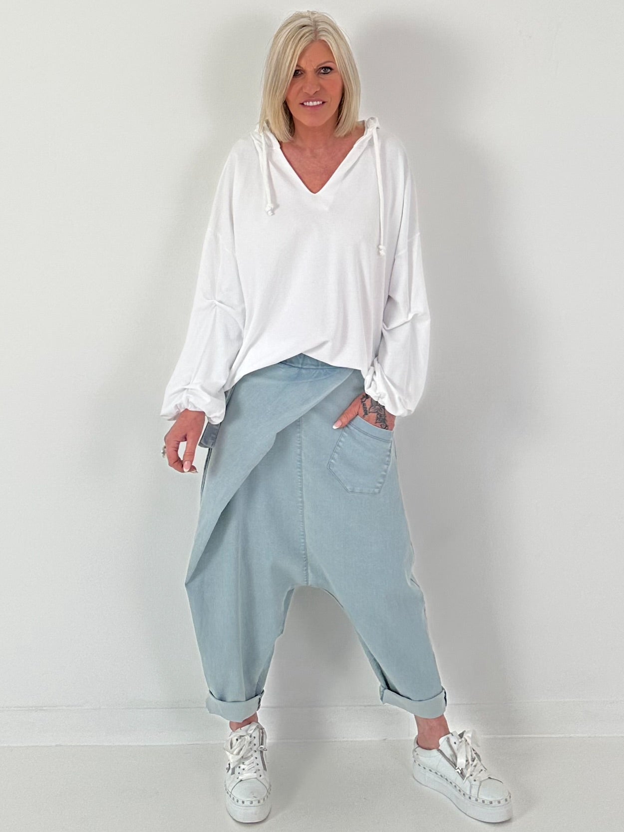 Diese trendige Baggy Jeans in softem Hellblau vereint lässigen Komfort mit einem ausdrucksstarken Design. Der locker geschnittene, tief angesetzte Schritt sorgt für eine entspannte, modische Silhouette. Die Vorderseite besticht durch eine markante, diagonal verlaufende Wickeloptik, die dem Modell eine besondere Linienführung verleiht. Eine aufgesetzte Tasche im Frontbereich setzt dabei einen sportiven Akzent.