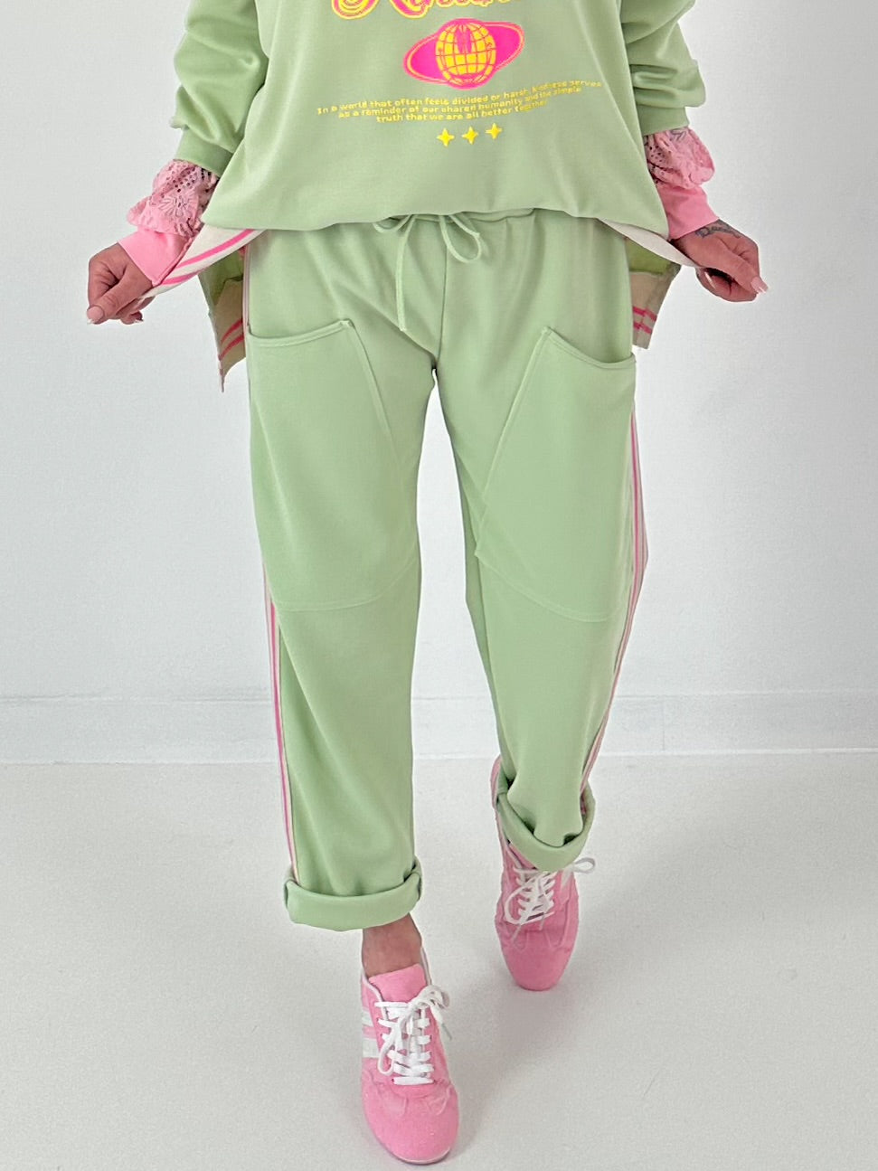 Der elastische Bund mit Tunnelzug garantiert eine flexible Passform und wird durch ein farblich abgestimmtes Bindeband ergänzt. Seitlich setzt ein dekorativer Streifen einen sportlichen Akzent und verleiht der Hose eine dynamische Optik. Zwei große, aufgesetzte Fronttaschen unterstreichen den lässigen Charakter und bieten praktischen Stauraum.