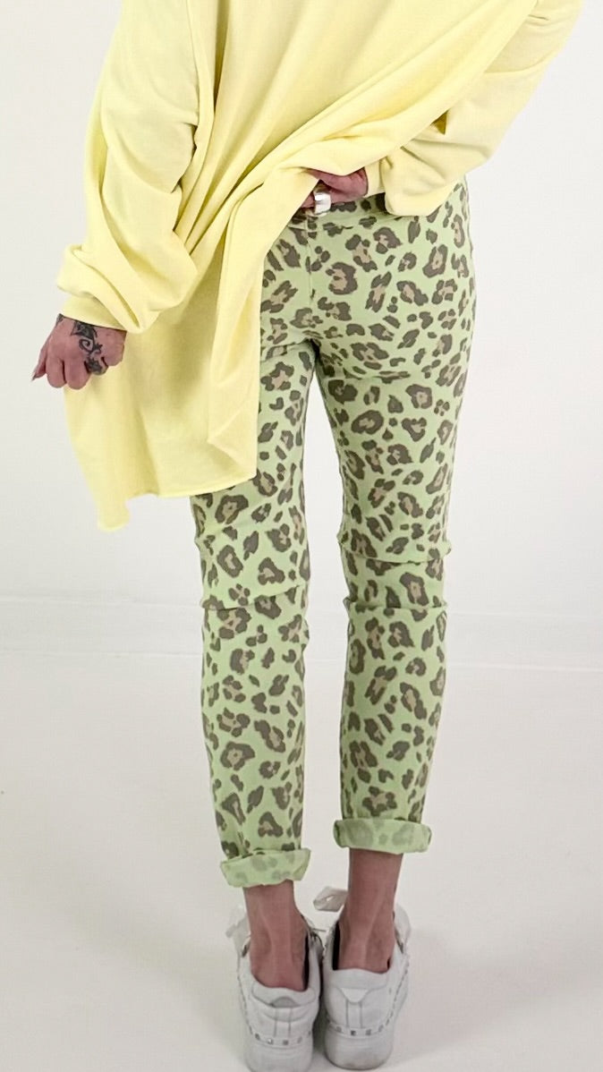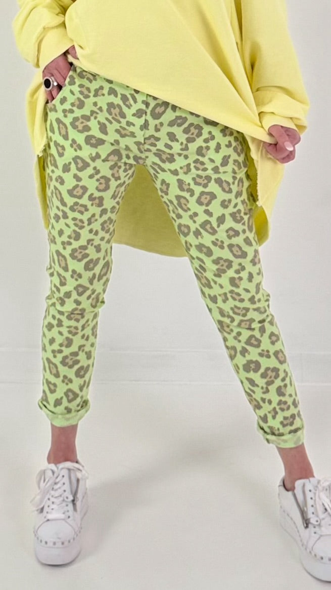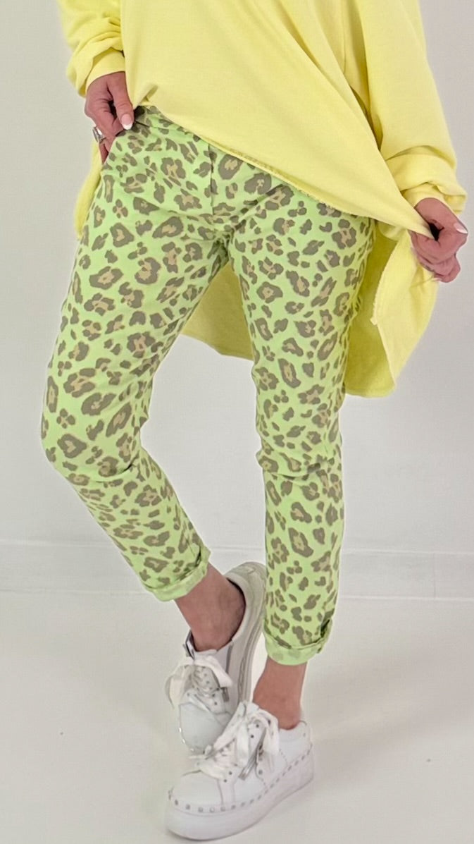 Diese modische Hose verbindet lässigen Komfort mit einem trendstarken Leo-Muster. Der schmal zulaufende Schnitt sorgt für eine moderne Silhouette, während das weiche, angenehm zu tragende Material ein hohes Maß an Komfort bietet. Der elastische Bund garantiert einen bequemen Sitz und passt sich optimal an die Figur an. Ergänzt wird er durch ein integriertes Bindeband, das individuell reguliert werden kann und zugleich einen sportiven Akzent setzt. Seitliche Eingriffstaschen bieten praktischen Stauraum und unterstreichen den entspannten Charakter der Hose. Diese Hose eignet sich sowohl für gemütliche Stunden zu Hause als auch für stylische Casual-Outfits unterwegs.