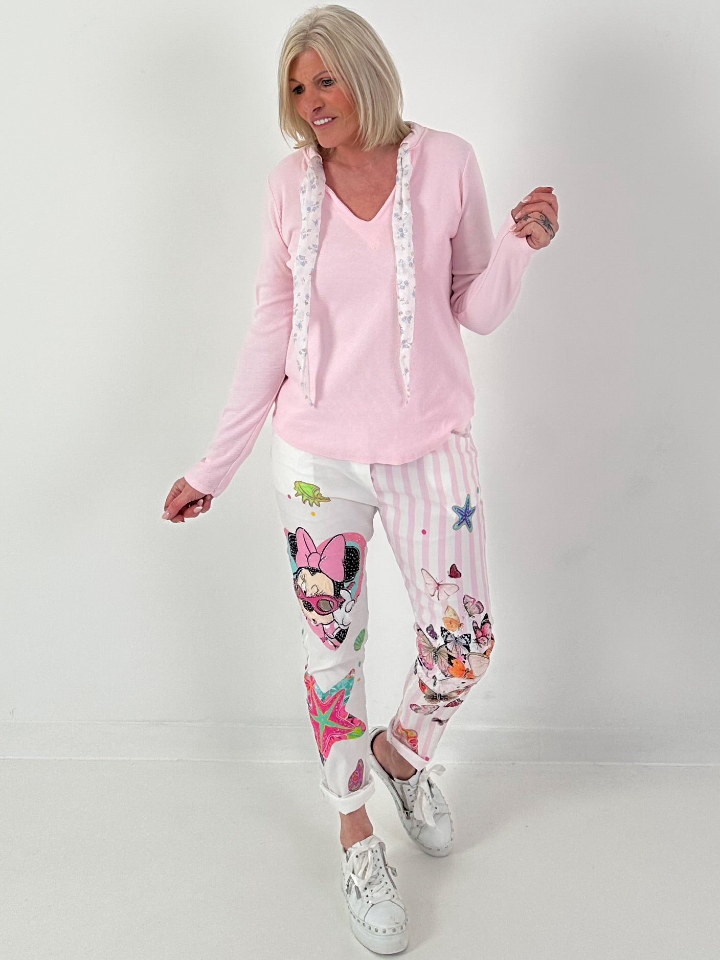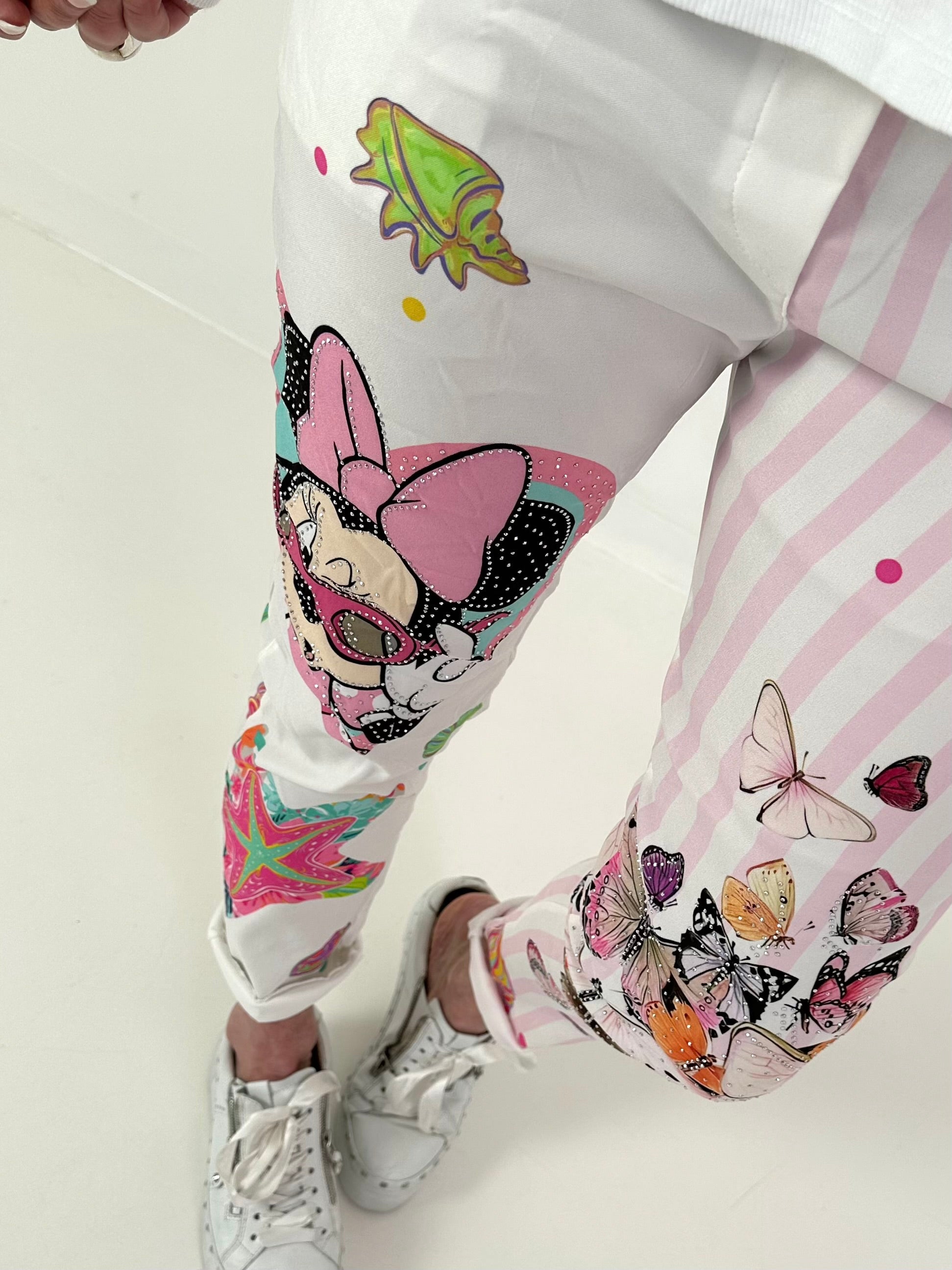 Das Design kombiniert eine weiße Grundfläche mit roséfarbenen Längsstreifen im angesagten Patchwork-Stil. Auf der Vorderseite zieht ein großes, verspieltes Comic-Motiv im Herzrahmen alle Blicke auf sich. Ergänzt wird der Look durch farbenfrohe Details wie Seesterne, Muscheln und kleine bunte Akzente. Das zweite Hosenbein ist mit zarten Schmetterlingsprints sowie weiteren dekorativen Elementen gestaltet, was der Hose eine kreative und sommerliche Ausstrahlung verleiht.