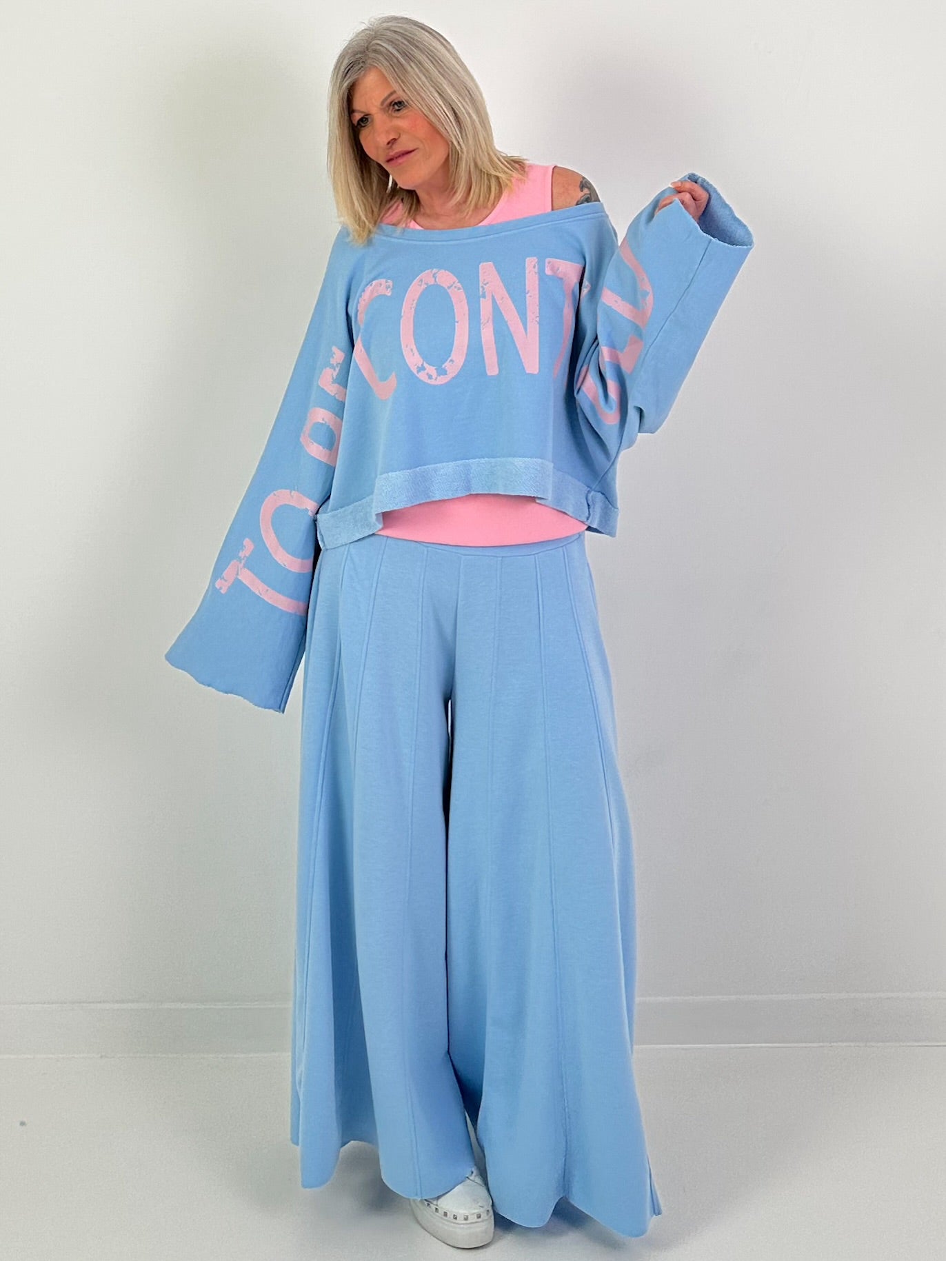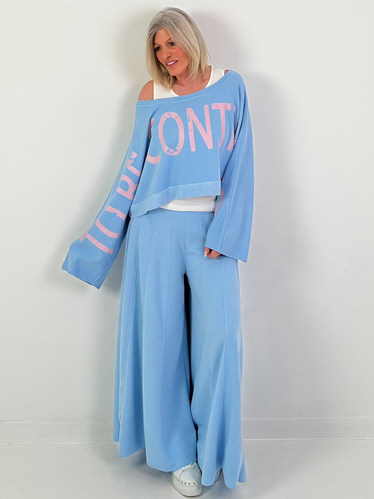 Der weite Beinverlauf verleiht der Hose eine luftige Silhouette und unterstreicht den femininen, zugleich trendbewussten Look. Vertikal verlaufende Teilungsnähte auf der Vorderseite strecken optisch das Bein und setzen dezente modische Akzente.