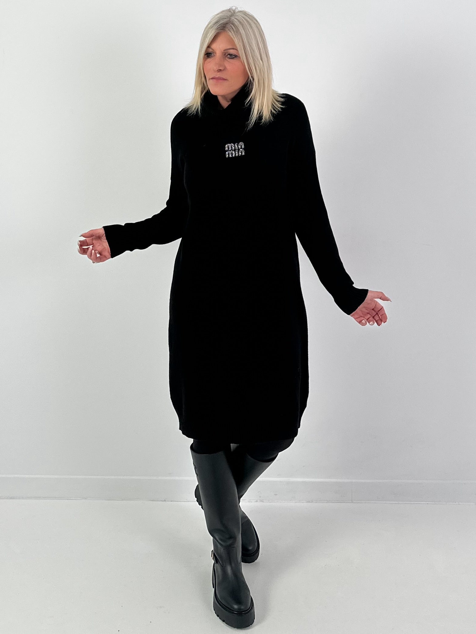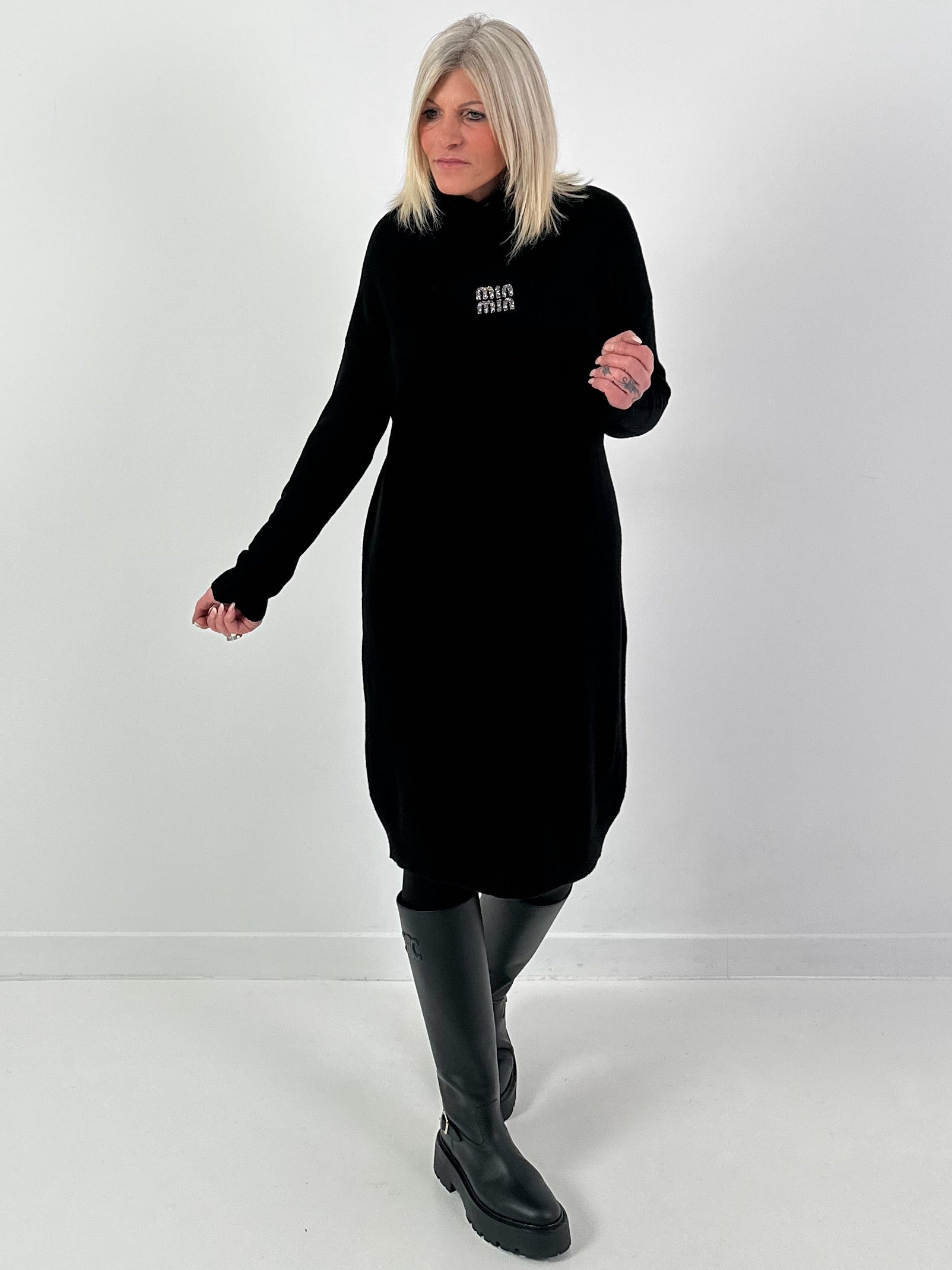 Mit diesem Strickkleid wird Gemütlichkeit zum Statement. Der weiche, elastische Feinstrick sorgt für maximalen Tragekomfort, während der hohe Rollkragen dich warm hält und optisch für Struktur sorgt. Besonders das Strass-Logo in der Mitte verleiht dem Kleid einen eleganten, aber modernen Touch. Gerippte Abschlüsse an Kragen, Ärmeln und Saum runden das Design clean ab – ein lässig, edles Stück für jeden Tag.