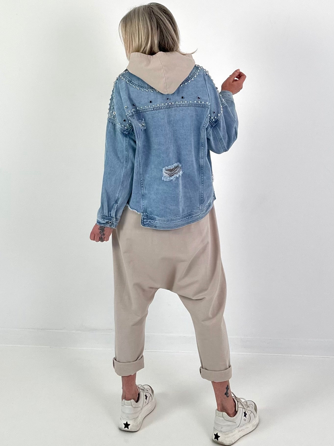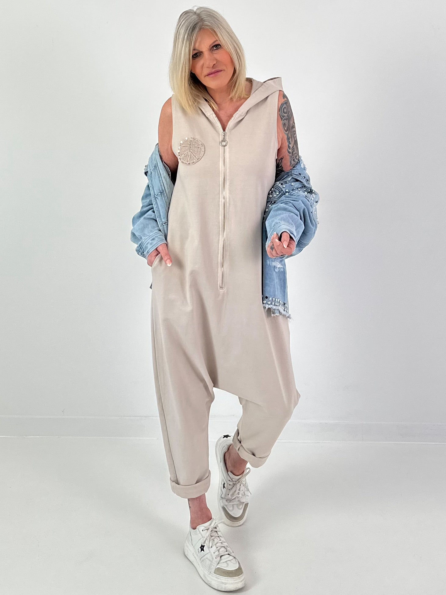 Dieser stylische Jumpsuit vereint Komfort und modisches Statement-Design in einem besonderen Onepiece. Gefertigt aus einem angenehm weichen, leicht elastischen Stoff bietet er ein bequemes Tragegefühl und passt sich der Figur schmeichelnd an. Der ärmellose Schnitt macht ihn perfekt für warme Tage oder zum Kombinieren mit Shirts und Jacken. Der Front-Reißverschluss mit dekorativem Zipper sorgt nicht nur für einfaches An- und Ausziehen, sondern setzt auch einen modernen Akzent. Die lässige Kapuze verleiht dem Look eine sportlich-coole Note. Besonderes Highlight sind die aufwendig gearbeiteten Peace-Symbole in Handarbeits-Optik: vorne dezent platziert und hinten als größerer Blickfang. Die gehäkelte Struktur wird durch schimmernde Pailletten und Perlen veredelt und sorgt für einen funkelnden Effekt. Das schmal zulaufende Bein rundet die moderne Passform ab. Ob in der Freizeit, auf Reisen oder als auffälliger Streetstyle – dieser Jumpsuit ist ein bequemer Hingucker mit liebevollen Details.
