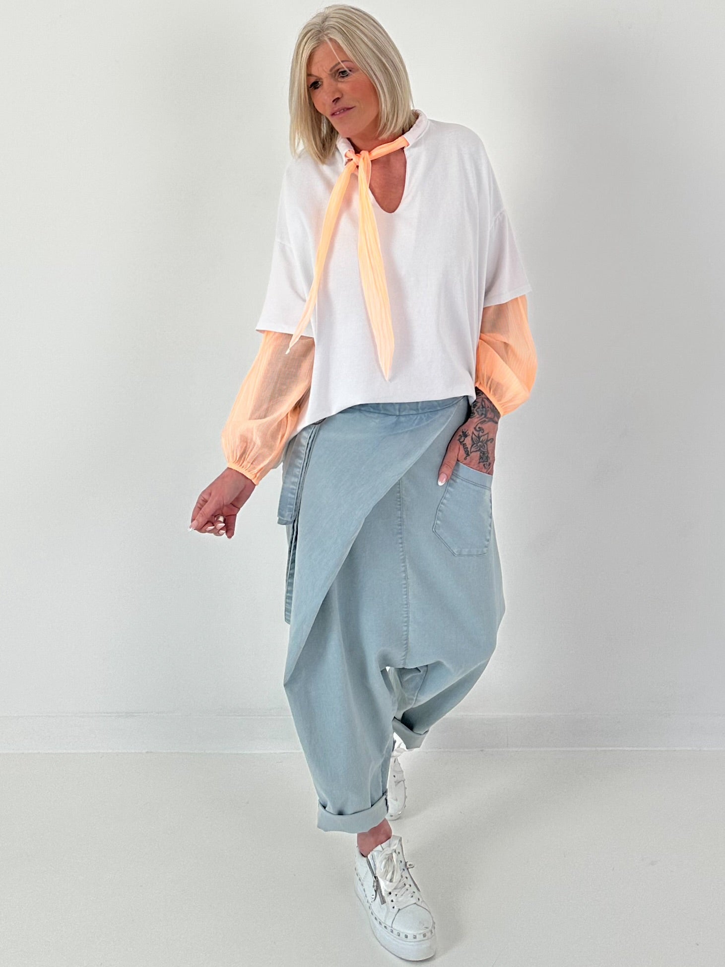 Dieser Sweater begeistert mit einem spannenden Materialmix und frischen Farbkontrasten. Die weich fließende Grundqualität sorgt für ein angenehmes Tragegefühl und eine locker fallende Silhouette. Der V-Ausschnitt ist feminin geschnitten und wird von dekorativen, langen Stoffbändern eingerahmt. Die Bänder setzen einen verspielten, modischen Akzent im Frontbereich. Ein besonderes Highlight sind die angesetzten Ärmel: Unter dem kurzen, weiten Ärmel kommt ein Blusenärmel mit feiner Streifenstruktur zum Vorschein.