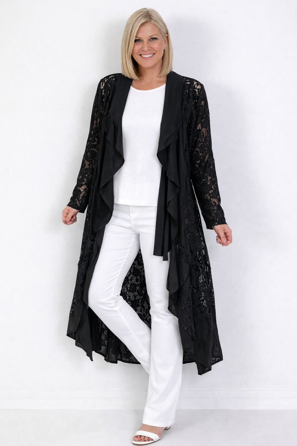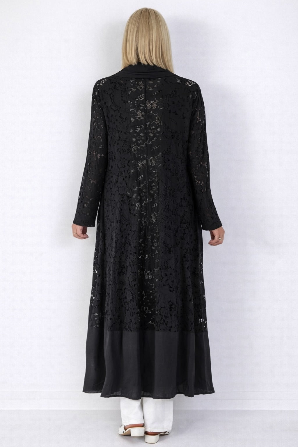 Dieser außergewöhnliche Leinenmantel vereint natürliche Materialien mit romantischer Leichtigkeit. Die Kombination aus luftigem Leinen und filigranem Spitzenmuster verleiht dem Modell eine elegante, zugleich lässige Ausstrahlung. Der Mantel ist offen geschnitten und kommt ohne Verschluss aus, wodurch er locker und fließend fällt. Ein markanter Wasserfallkragen aus glattem Leinen setzt einen modernen Akzent und rahmt die Frontpartie weich ein. Die großflächige, transparente Spitze mit floralem Muster sorgt für eine edle Optik und unterstreicht den femininen Charakter des Designs. Die Ärmel sind komfortabel geschnitten und greifen das Spitzenmuster vollständig auf. Am Saum setzen Partien aus reinem Leinen zusätzliche Akzente und verleihen dem Mantel eine besondere Struktur. Dieses Modell eignet sich ideal als stilvollen Überwurfmantel für wärmere Tage oder als modisches Layering-Piece über Kleidern, Tops oder schlichten Outfits.