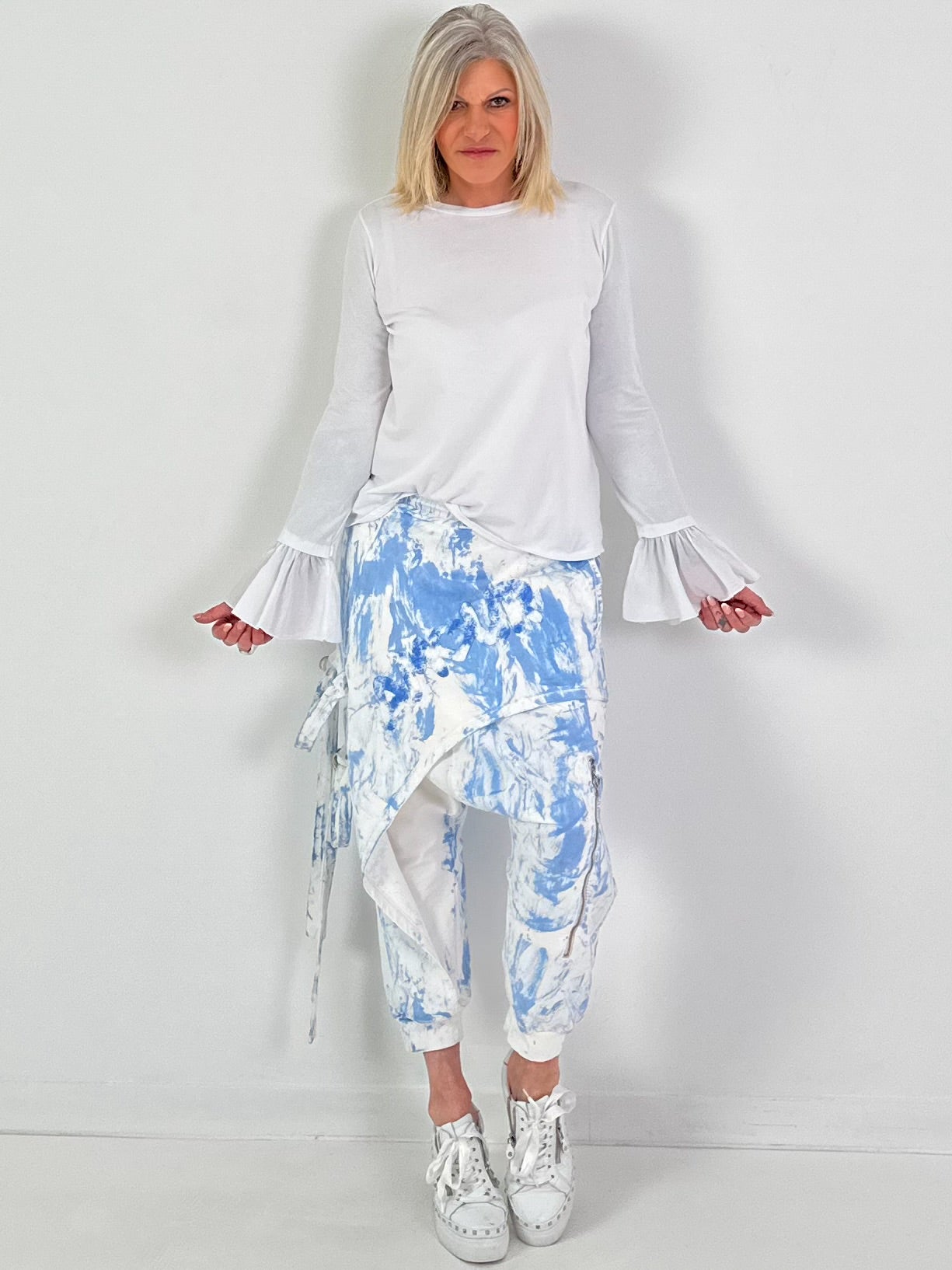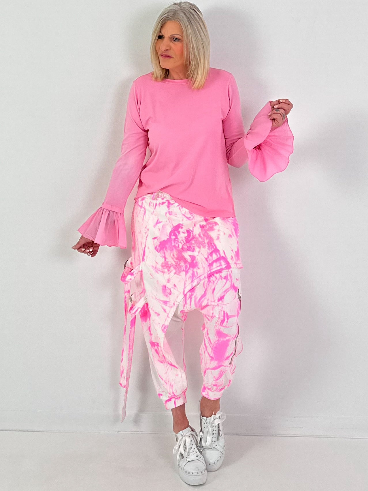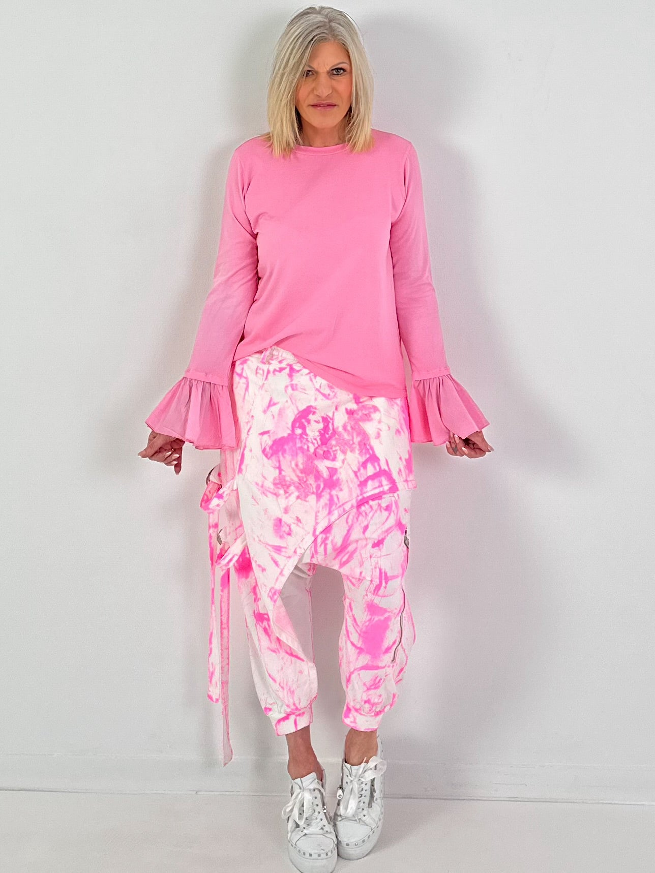 Highlight sind die angesetzten Volant-Ärmelabschlüsse, die dem Shirt eine verspielte, elegante Note verleihen. Das leichte, fließende Material fällt weich und macht das Shirt zum perfekten Begleiter für Alltag, Büro oder besondere Anlässe