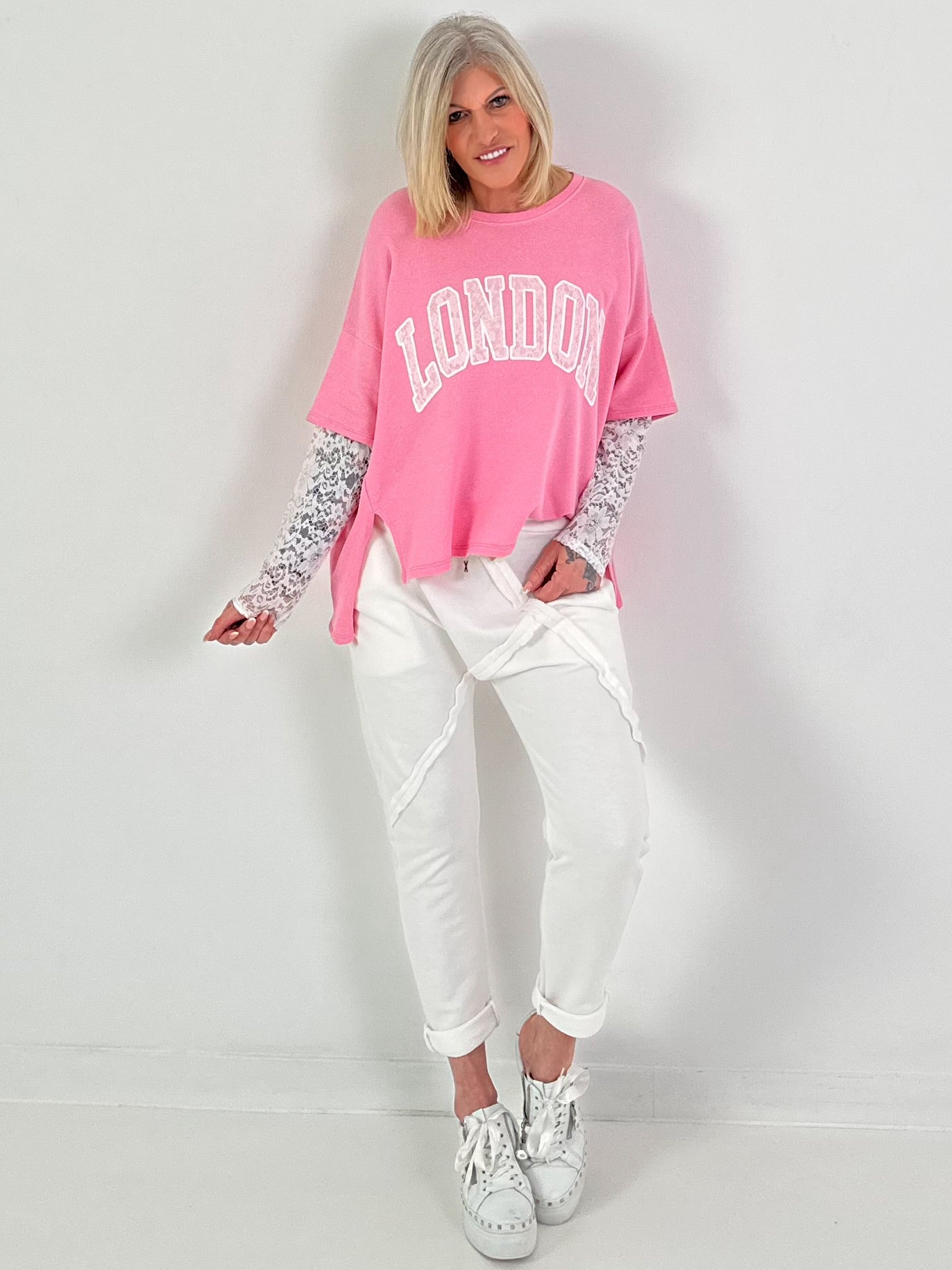 Dieses modische Sweater vereint sportiven Casual-Style mit femininen Details. Der locker fallende Schnitt sorgt für eine lässige Silhouette und ein angenehmes Tragegefühl. Auf der Vorderseite setzt der große „LONDON“ Schriftzug einen trendigen Statement-Akzent. Besonderes Highlight sind die angesetzten Spitzenärmel, die unter den weiten Kurzarm-Ärmeln hervorschauen und dem Look eine verspielte, elegante Note verleihen. Der klassische Rundhalsausschnitt sowie das weiche, leicht strukturierte Material runden das Design harmonisch ab. Perfekt kombinierbar zu Jeans, Shorts oder Röcken – ideal für stylische Freizeit-Outfits mit einem Hauch Romantik.