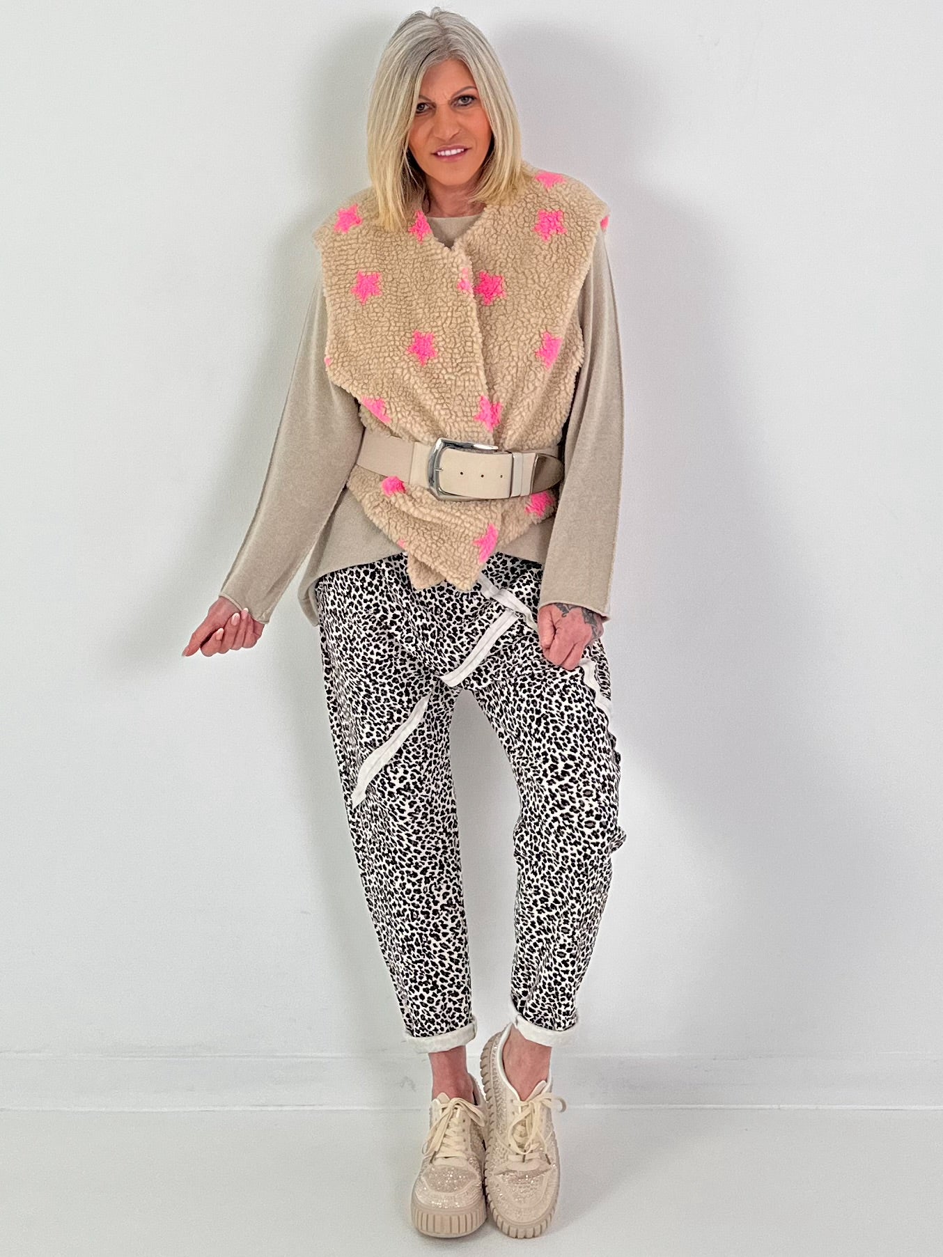 Durch ihren lockeren, leicht kastigen Schnitt fällt sie bequem und sorgt für Bewegungsfreiheit im Alltag. Ob zu Jeans, Leggings oder Kleidern kombiniert – diese Teddyfell-Weste mit Sternenprint ist ein modischer Hingucker mit hohem Kuschelfaktor und eignet sich perfekt für Herbst, Winter oder frische Frühlingstage.