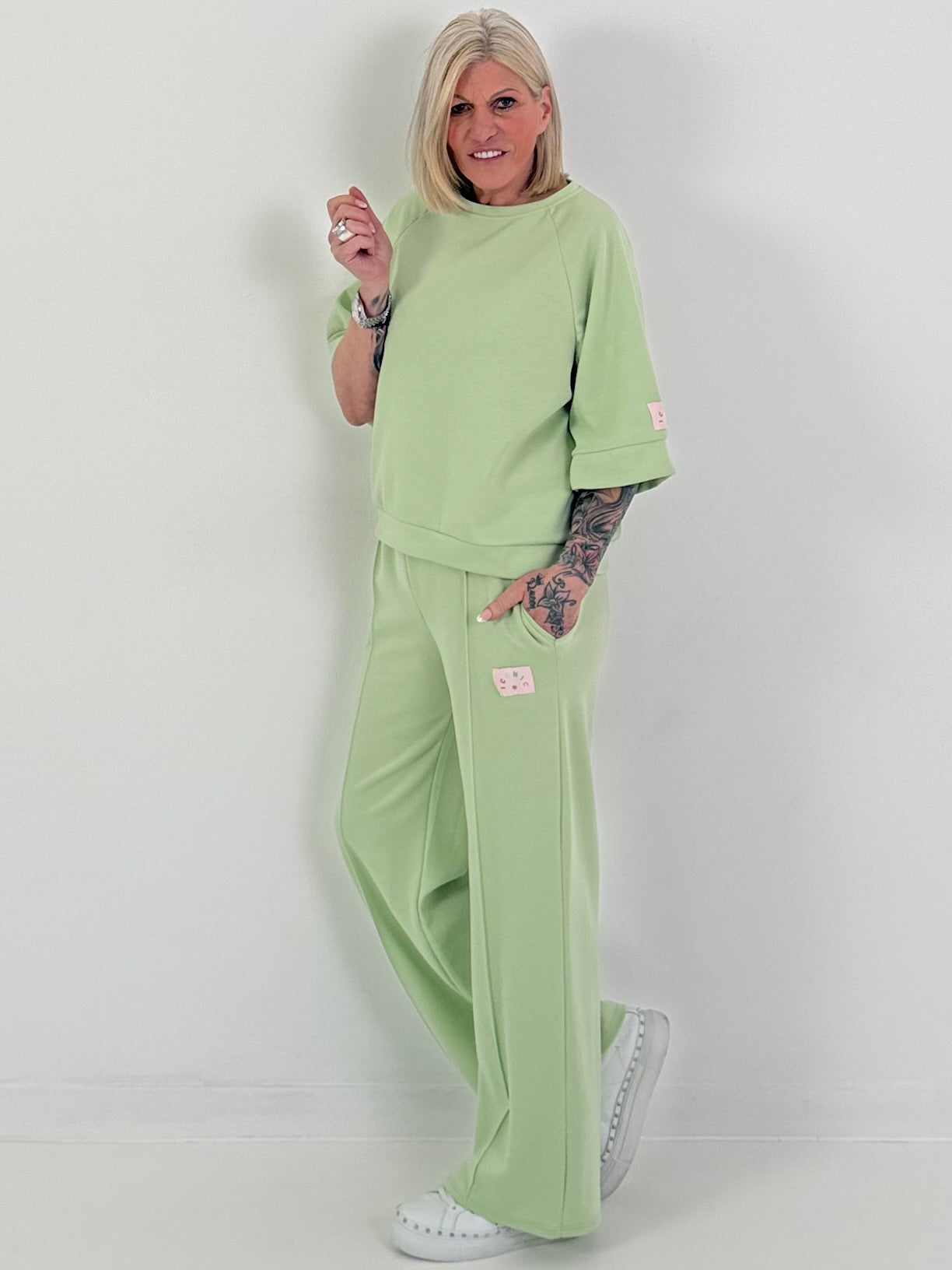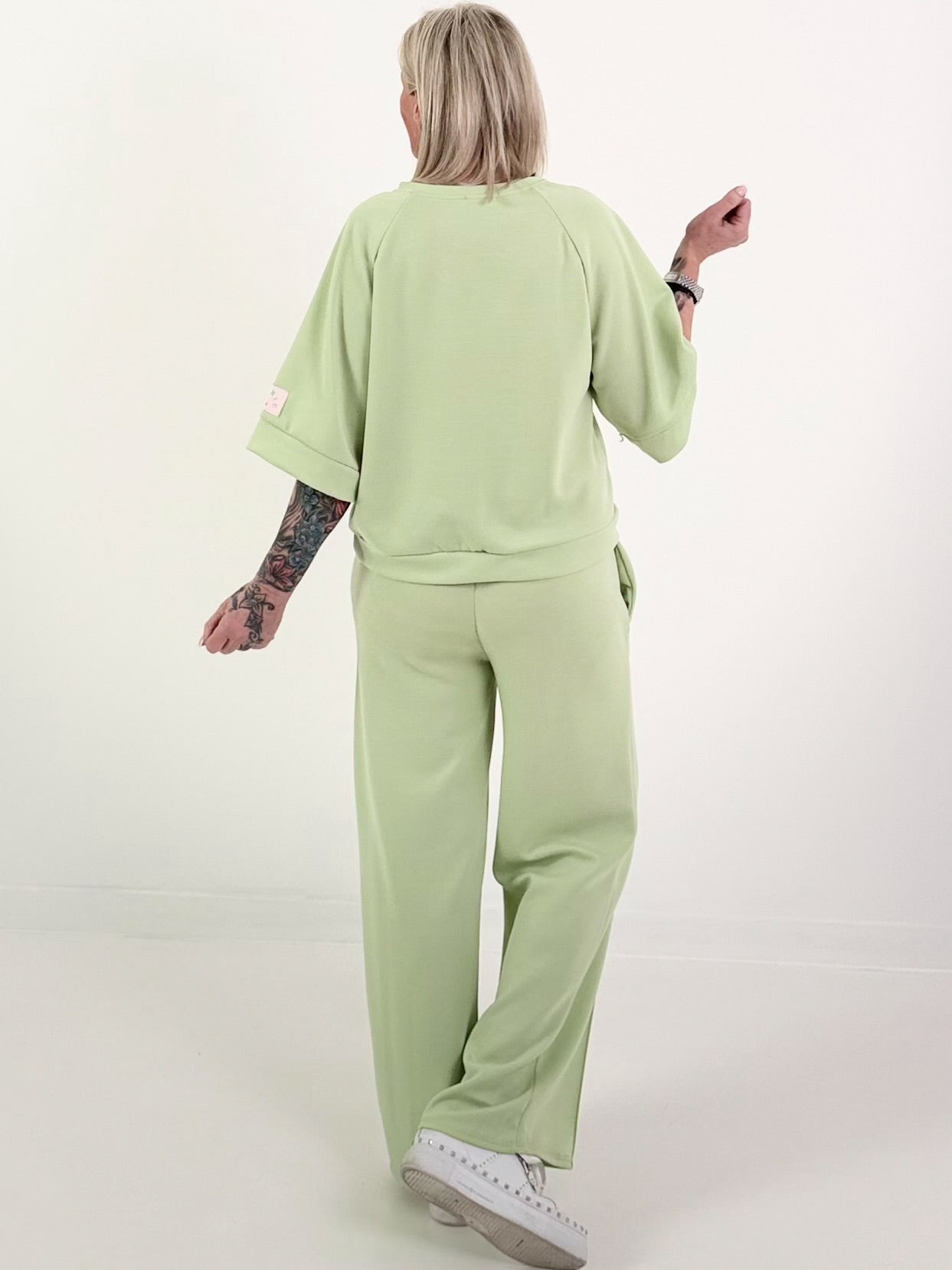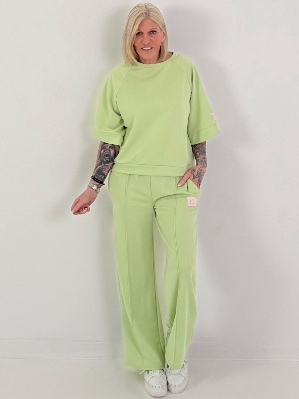 Der Zweiteiler wirkt der frisch, modern und vielseitig kombinierbar – perfekt für entspannte Freizeit-Looks, stylische Homewear oder einen komfortablen Alltagsauftritt mit modischem Anspruch.