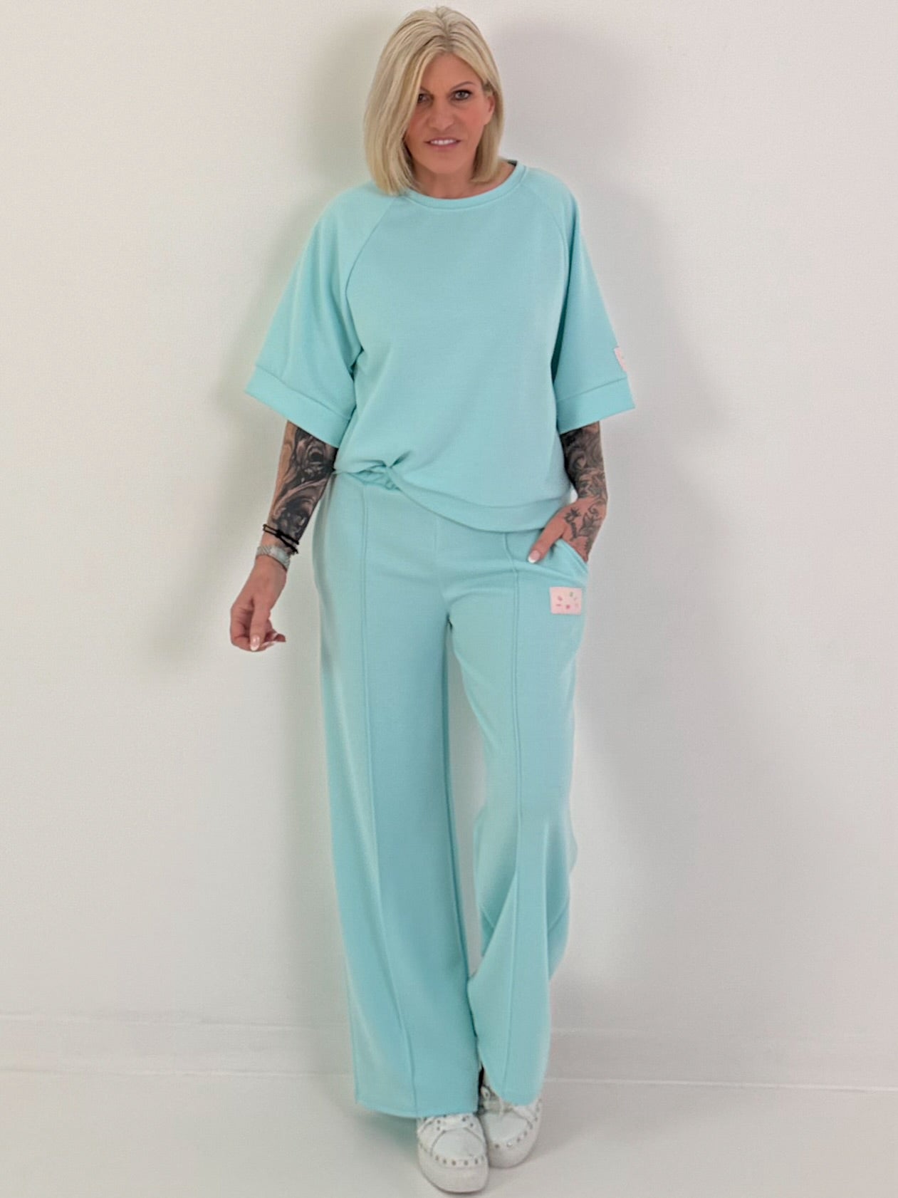 Das Oberteil ist locker fallend geschnitten und endet mit breiten, formstabilen Bündchen an Ärmeln und Saum. Ein liebevolles Detail ist das aufgenähte Patch am Ärmel mit buntem „ICONIC“-Schriftzug und kleinem Herz, das dem minimalistischen Design eine verspielte Note verleiht. Die Hose begeistert mit einem bequemen Gummibund und geradem, weit geschnittenem Bein, das für eine schmeichelhafte Silhouette und maximale Bewegungsfreiheit sorgt. Auch hier findet sich das charakteristische Patch-Detail als stilvoller Hingucker wieder.