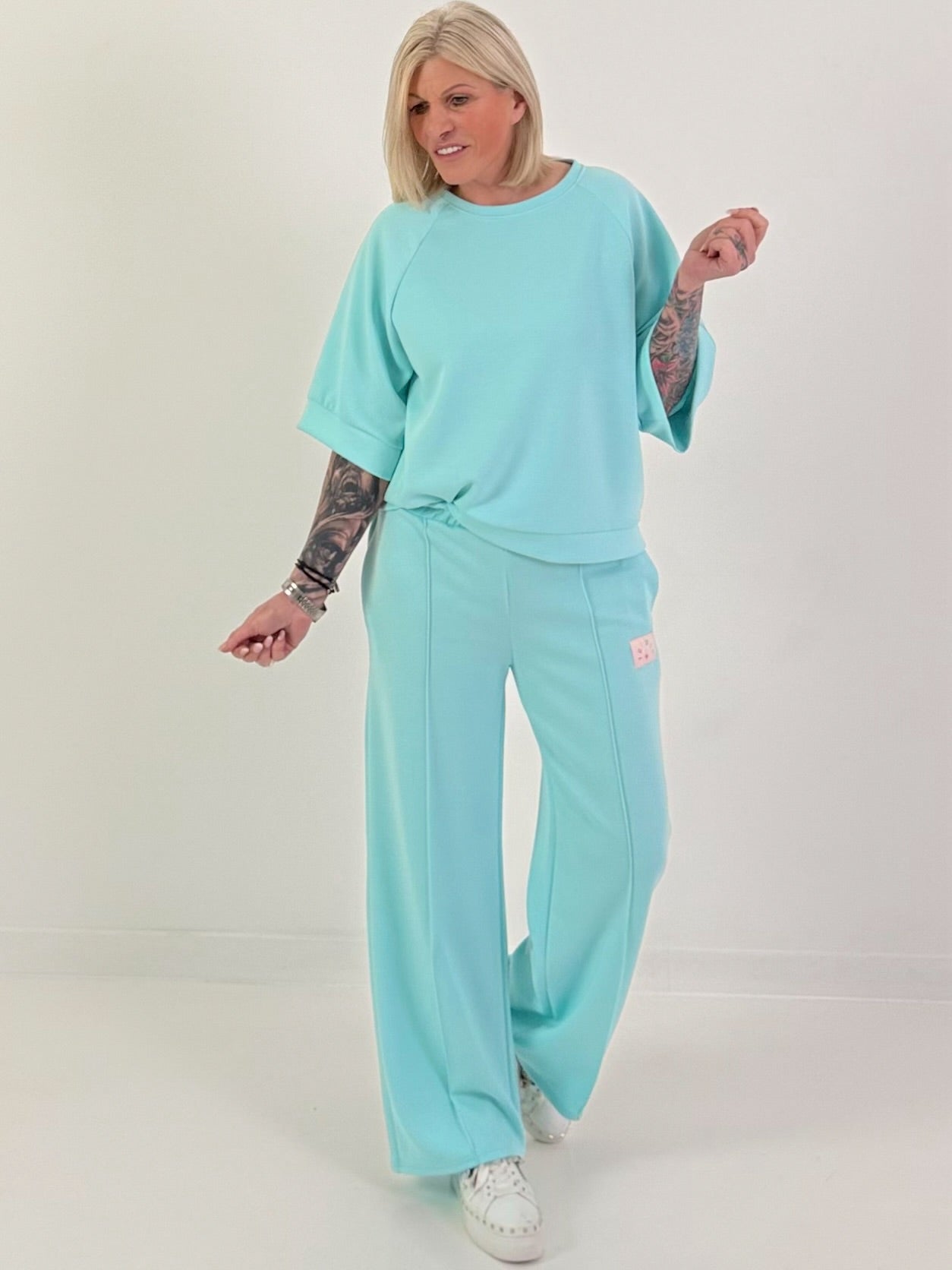 Der Zweiteiler wirkt der frisch, modern und vielseitig kombinierbar – perfekt für entspannte Freizeit-Looks, stylische Homewear oder einen komfortablen Alltagsauftritt mit modischem Anspruch.