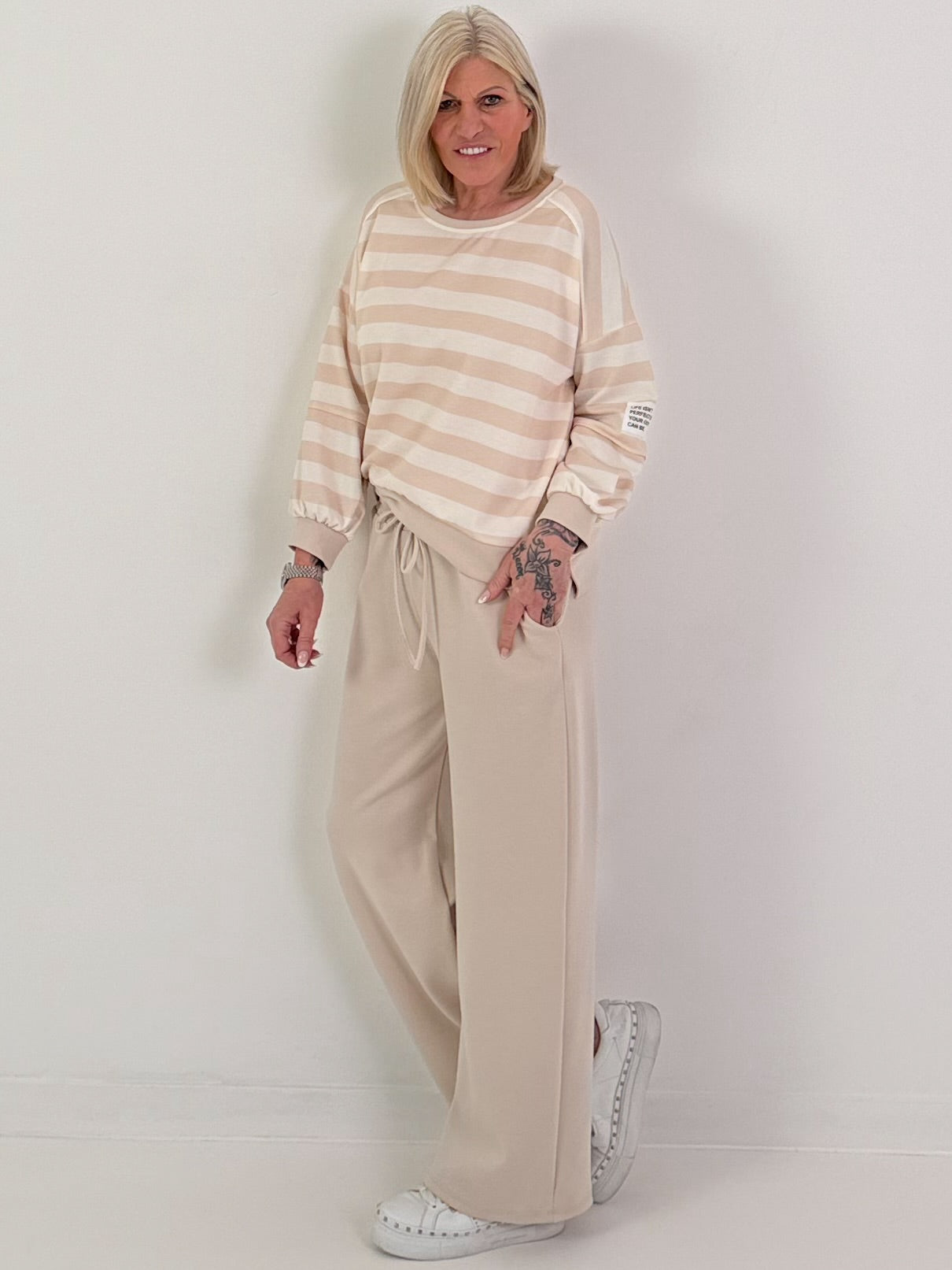 Dieser feminine Zweiteiler vereint Komfort und modisches Statement in einem harmonischen Design. Das locker geschnittene Sweatshirt begeistert mit einem klassischen Rundhalsausschnitt, lässigen Raglanärmeln und breiten Bündchen. Das zarte Streifenmuster verleiht dem Oberteil eine frische, verspielte Ausstrahlung. Ein besonderes Highlight ist das aufgenähte Statement-Patch am Ärmel mit der Aufschrift „Life isn’t perfect but your outfit can be.“, das dem Look eine moderne und selbstbewusste Note verleiht.