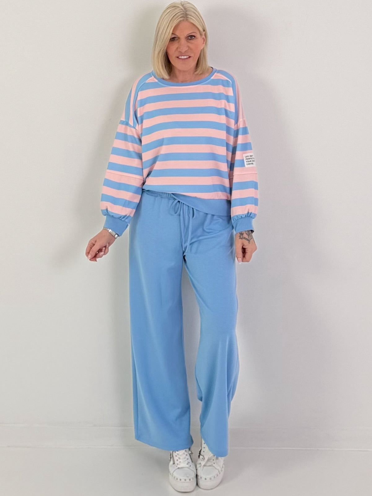 Dieser feminine Zweiteiler vereint Komfort und modisches Statement in einem harmonischen Design. Das locker geschnittene Sweatshirt begeistert mit einem klassischen Rundhalsausschnitt, lässigen Raglanärmeln und breiten Bündchen. Das zarte Streifenmuster verleiht dem Oberteil eine frische, verspielte Ausstrahlung. Ein besonderes Highlight ist das aufgenähte Statement-Patch am Ärmel mit der Aufschrift „Life isn’t perfect but your outfit can be.“, das dem Look eine moderne und selbstbewusste Note verleiht.