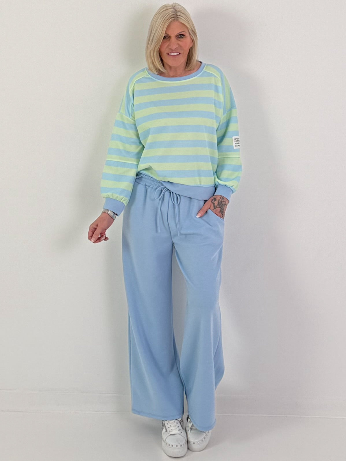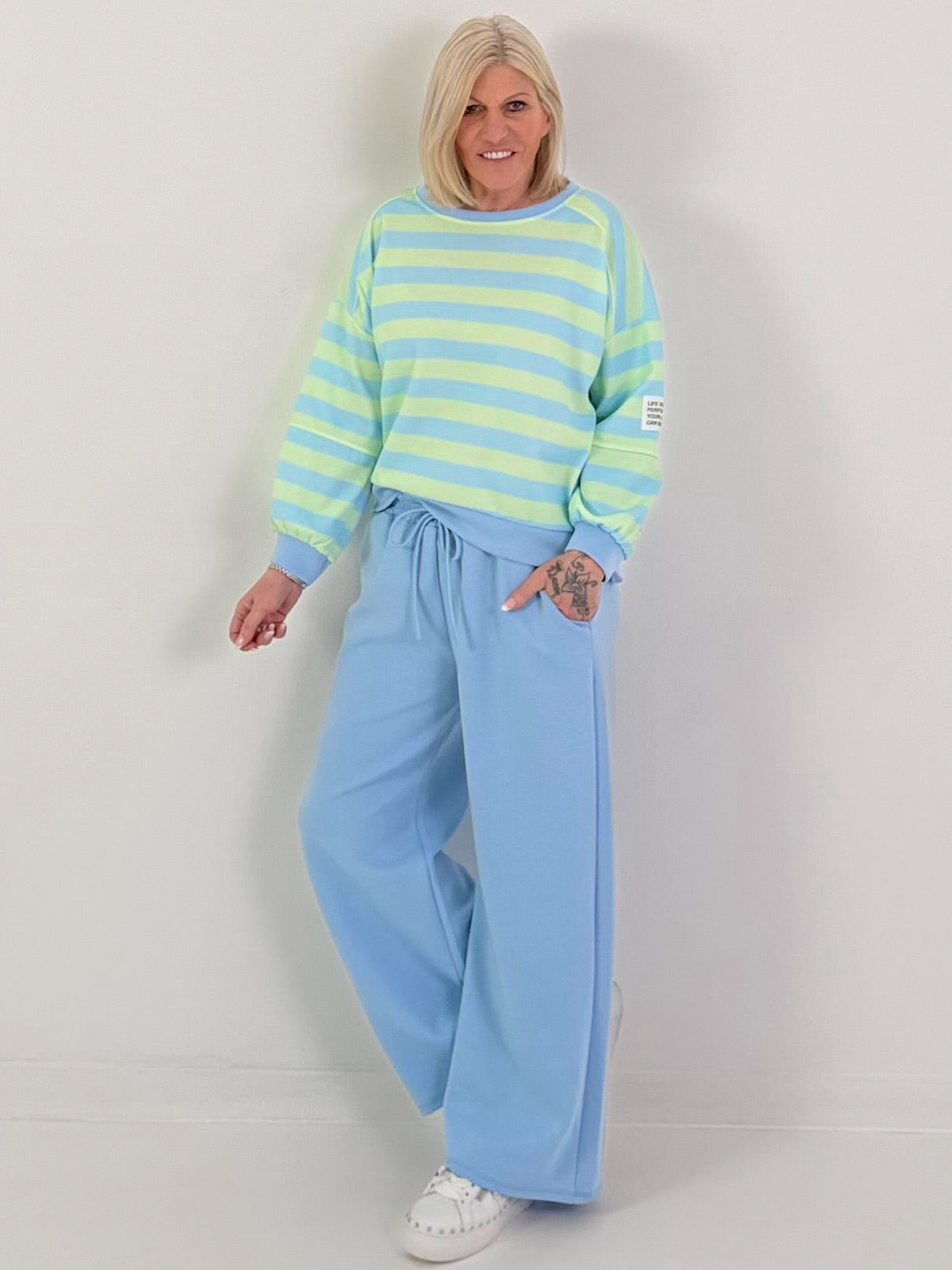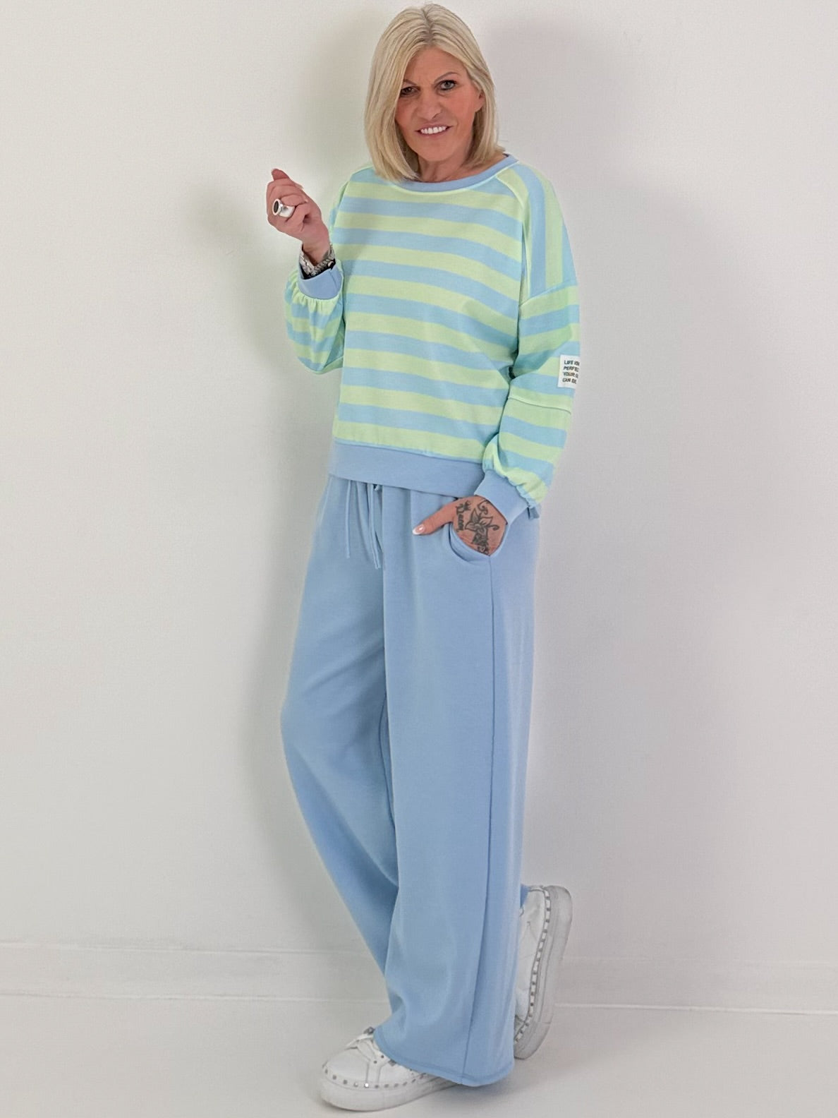 Dieser feminine Zweiteiler vereint Komfort und modisches Statement in einem harmonischen Design. Das locker geschnittene Sweatshirt begeistert mit einem klassischen Rundhalsausschnitt, lässigen Raglanärmeln und breiten Bündchen. Das zarte Streifenmuster verleiht dem Oberteil eine frische, verspielte Ausstrahlung. Ein besonderes Highlight ist das aufgenähte Statement-Patch am Ärmel mit der Aufschrift „Life isn’t perfect but your outfit can be.“, das dem Look eine moderne und selbstbewusste Note verleiht.