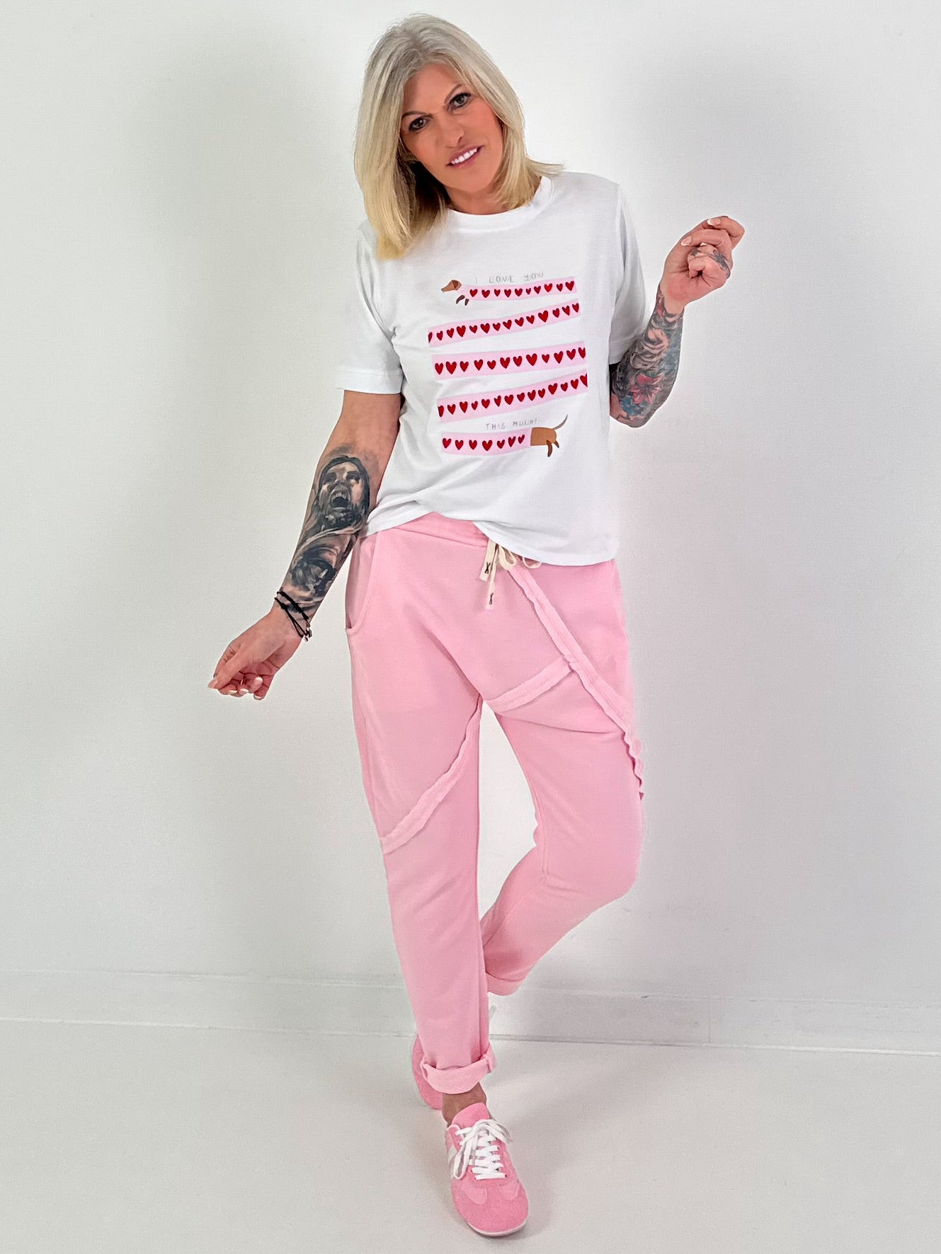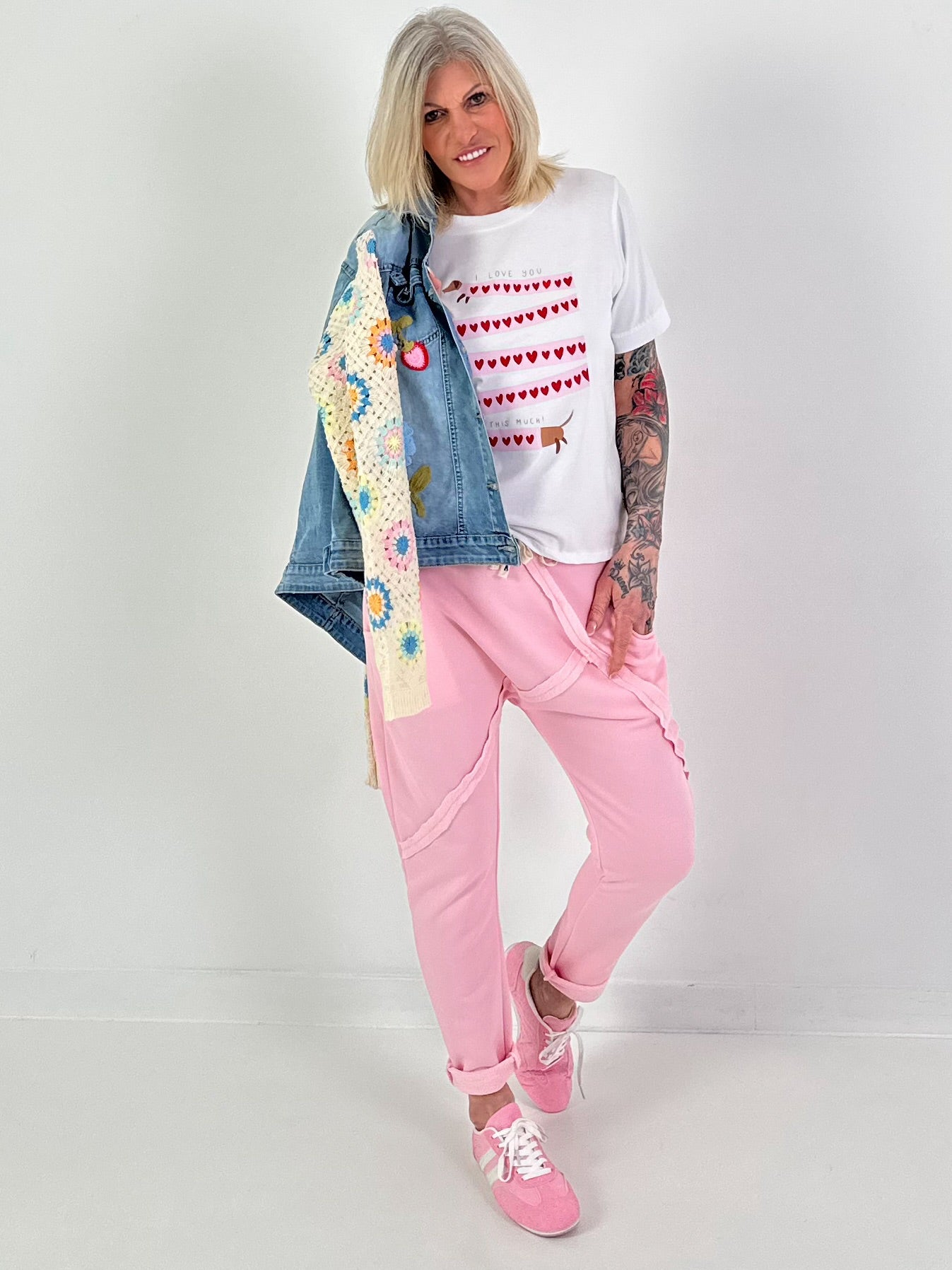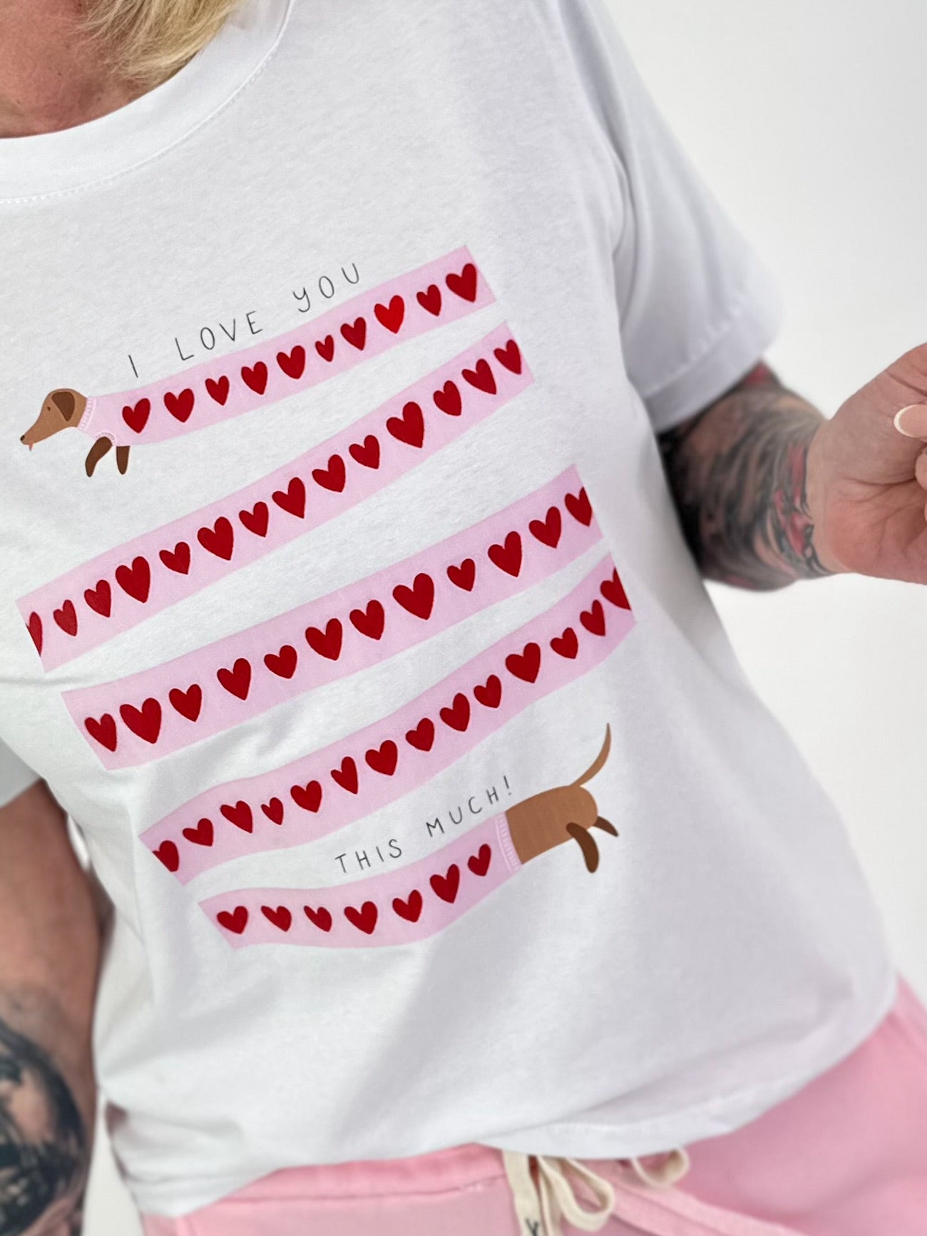 Dieses lässige T-Shirt überzeugt mit einem verspielten, liebevollen Frontprint und hohem Tragekomfort. Der locker geschnittene Fit mit leicht verkürzter Länge sorgt für eine moderne, entspannte Silhouette. Auf der Vorderseite setzt ein niedlicher Print mit Dackel-Motiv, roten Herzstreifen und dem Schriftzug „I love you – this much“ einen charmanten Statement-Akzent. Der klassische Rundhalsausschnitt sowie die weichen, kurzen Ärmel unterstreichen den unkomplizierten Casual-Look. Das angenehm leichte, hautfreundliche Material macht das Shirt zum idealen Begleiter für Alltag und Freizeit – perfekt kombinierbar zu Jeans, Shorts oder Röcken für einen süßen, trendigen Style.