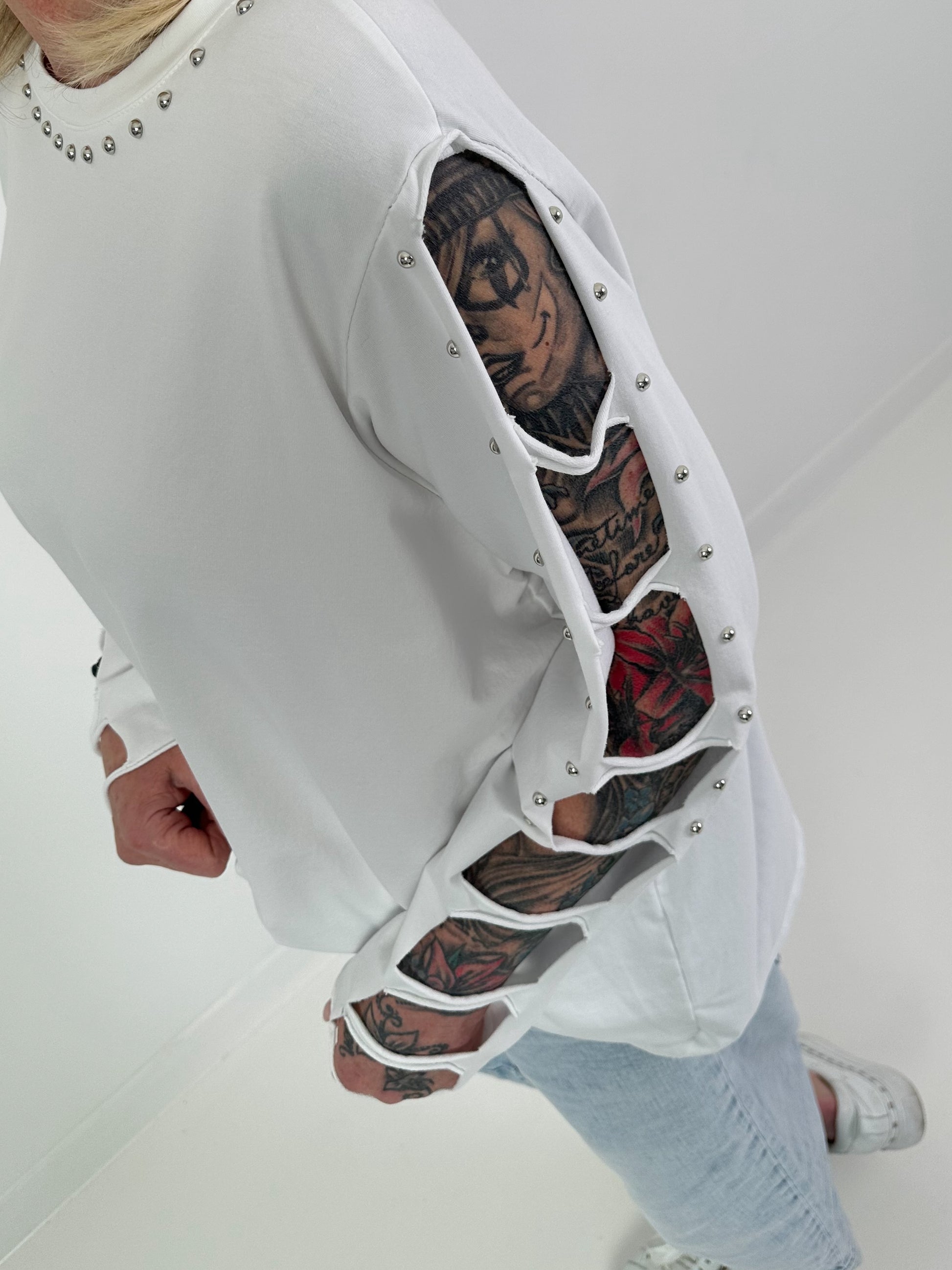 Ein besonderer Hingucker sind die aufwendig gearbeiteten Ärmel: Seitlich verlaufende Zierbänder mit eingearbeiteten Nieten schaffen eine raffinierte Cut-Out-Optik, die dem Longsleeve eine moderne, leicht rockige Note verleiht. Die langen Ärmel fallen locker und unterstreichen den lässig-eleganten Stil.