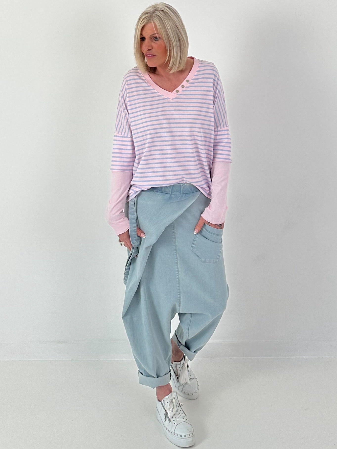 Der V-Ausschnitt wird durch dekorative Knöpfe stilvoll akzentuiert. Die locker geschnittene Passform sorgt für einen lässigen Fall und angenehme Bewegungsfreiheit.