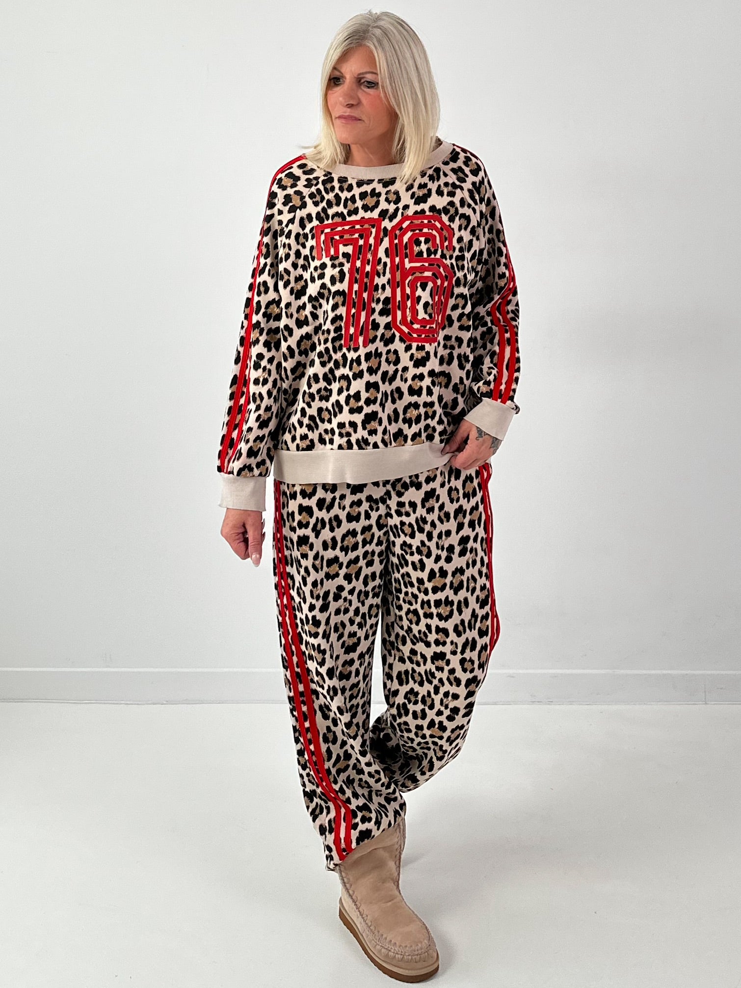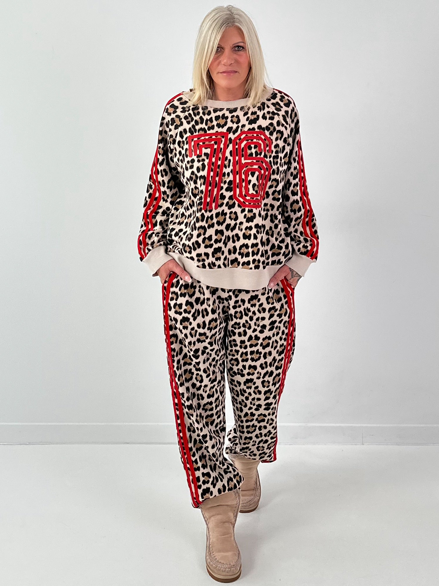 Der Sweatshirt "Leo Racer" bringt sportliche Dynamik und wilden Animal-Look auf den Punkt. Mit seinem klassischen Rundhalsausschnitt und dem auffälligen Leoprint zieht er sofort alle Blicke auf sich. Highlight ist die plakative „76“ auf der Vorderseite, die dem Design eine lässige Retro-Sport-Note verleiht. Rote Streifen über Schultern und Ärmel unterstreichen den Racing-Vibe und setzen einen starken Kontrast. Dank der soften Qualität und der bequemen Passform wird dieses Sweatshirt schnell zum Favoriten für coole alltägliche Looks mit Charakter.