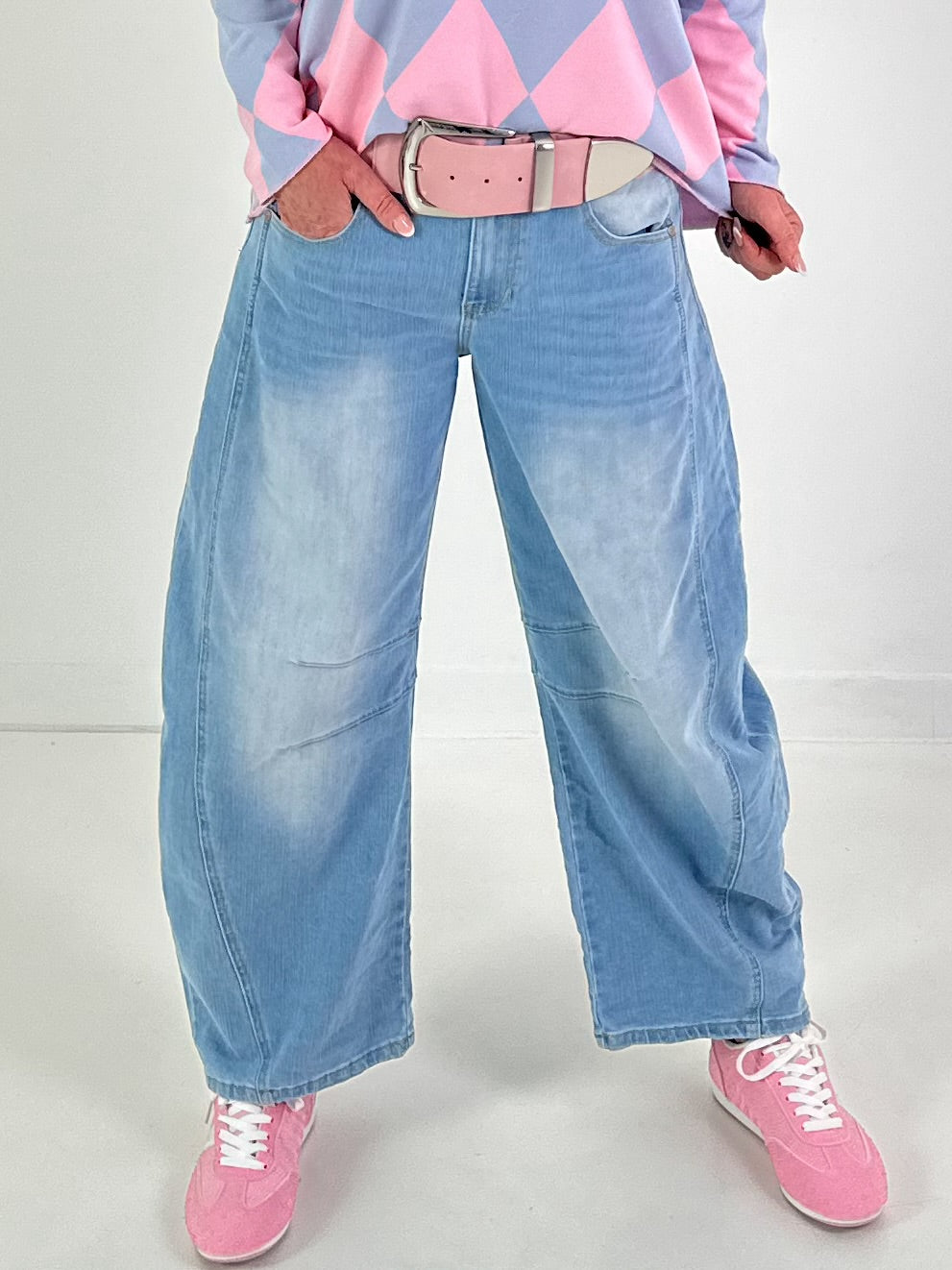 Moderne Ballonjeans aus weichem, hellblauem Denim mit angesagter Balloon-Passform. Der Schnitt ist oben locker und voluminös, verläuft zum Beinabschluss hin schmaler und sorgt so für eine lässige, trendbewusste Silhouette. Die Jeans verfügt über klassische Details wie Knopf- und Reißverschluss, Gürtelschlaufen sowie Vorder- und Gesäßtaschen. Dezente Used-Waschung und leichte Falteneffekte verleihen ihr einen authentischen Casual-Look. Ideal kombinierbar mit schlichten Tops, Strick oder Cropped-Jacken – perfekt für Alltag und Freizeit.