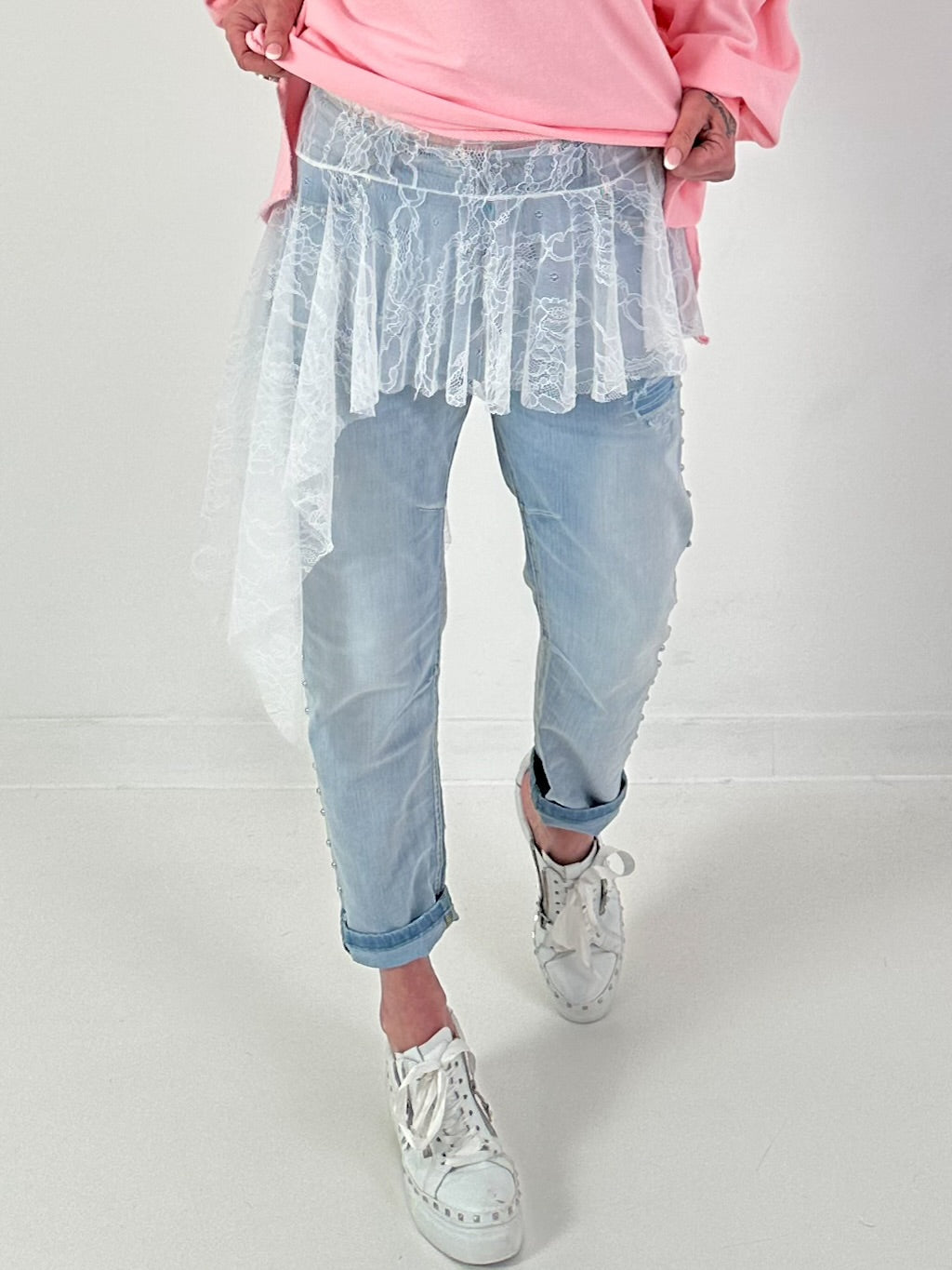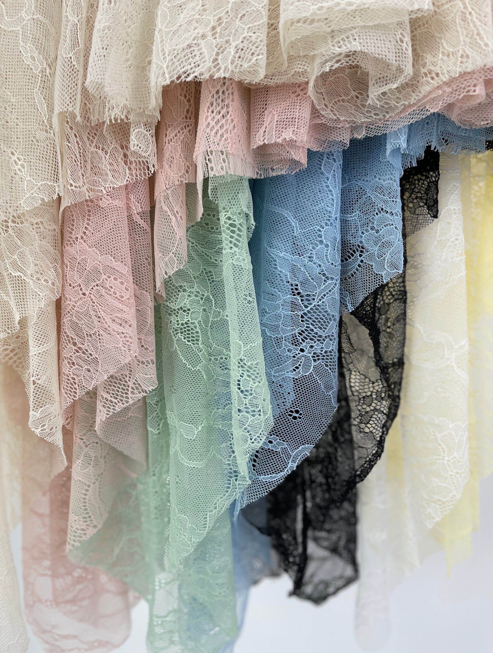 Besonderes Highlight ist der angesetzte Volantbereich. Mehrlagig fallende Spitzenrüschen sorgen für zusätzliches Volumen und eine verspielte Silhouette. Die untere Kante ist wellenförmig gearbeitet und folgt der floralen Spitzenstruktur, was den femininen Look nochmals unterstreicht. Er ist perfekt, um Outfits zu verlängern, transparenter Mode mehr Bedeckung zu geben oder schlichte Looks aufzuwerten.