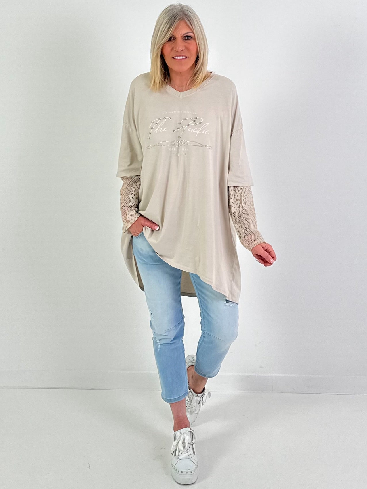 Besonderes Highlight sind die Ärmel mit Spitzen-Einsatz: Der Mix aus Baumwolle und zarter Spitze verleiht dem Shirt eine elegante Leichtigkeit und macht es zu einem vielseitigen Styling-Piece. Der verlängerte Saum unterstreicht den Oversize-Look und sorgt für ein angenehmes Tragegefühl.