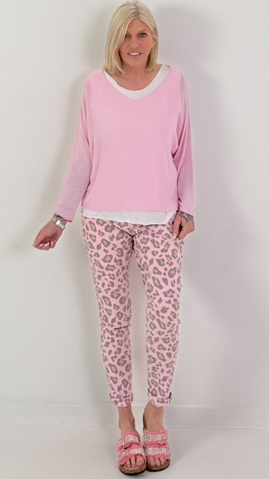 Dieser moderne Feinstrickpullover besteht aus zwei aufeinander abgestimmten Teilen und vereint lässigen Komfort mit einem trendbewussten Look. Er setzt sich aus einem leichten, fein gestricktem Pullover und einem passenden Top zusammen, was vielseitig kombiniert werden kann. Das Top ist nicht eingenäht, sondern wird eigenständig unter dem Pullover getragen, wodurch sich beide Teile auch einzeln stylen lassen. Der Pulli überzeugt durch seinen weiten, fließenden Schnitt und lockeren Ärmeln, die zum Abschluss hin schmaler zulaufen. Der weite Rundhalsausschnitt, die Ärmel und der Saum werden durch Lurexnähte hervorgehoben und verleihen dem Modell eine elegante Note.