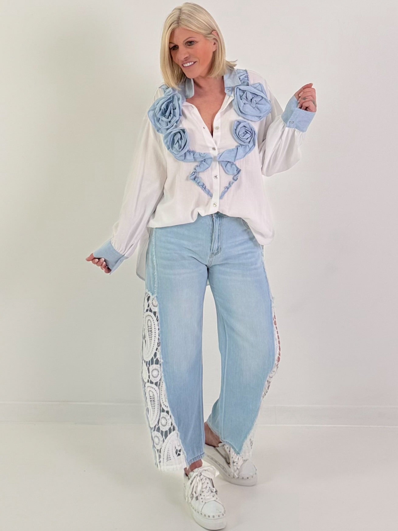 Bluse mit Hemdkragen und durchgehender Knopfleiste im vorderen Bereich. Das Modell hat lange Ärmel mit breiten Manschetten. Im Brustbereich sind Stoffblüten-Applikationen angebracht. Kragen, Blüten und Manschetten sind in Denim-Optik gehalten.