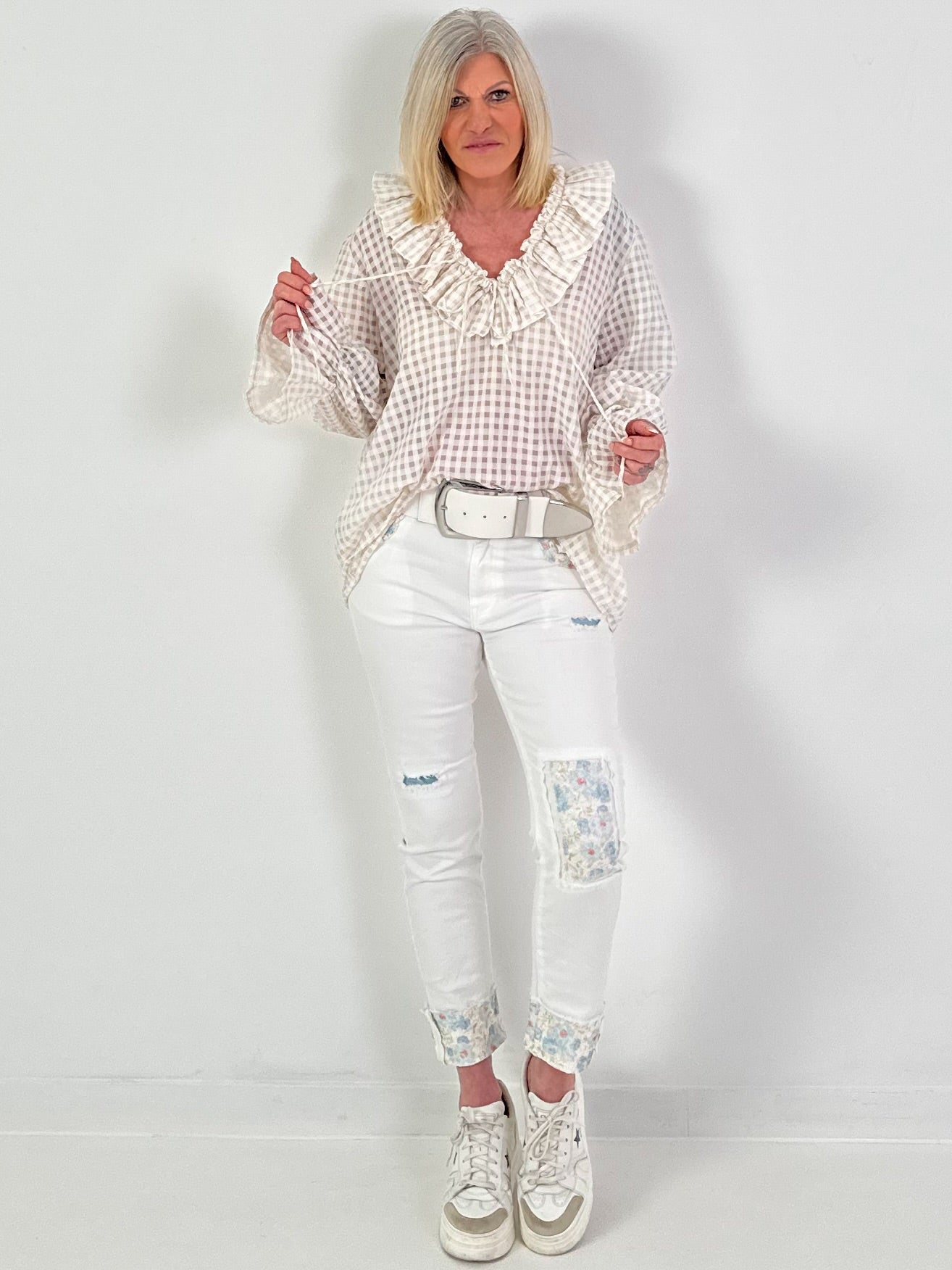 Diese bezaubernde Tunika überzeugt durch ihr feines Vichy Muster und verspielte, feminine Details. Der locker fallende Schnitt sorgt für ein angenehmes Tragegefühl und macht die Tunika zum perfekten Begleiter für Alltag und Freizeit.