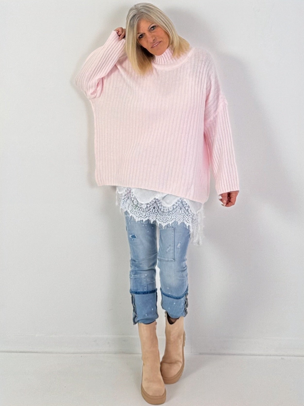 Ob zur Jeans, Stoffhose oder über einem Rock getragen – dieser Pullover lässt sich mühelos kombinieren und bringt Wärme und Stil in jede Garderobe.