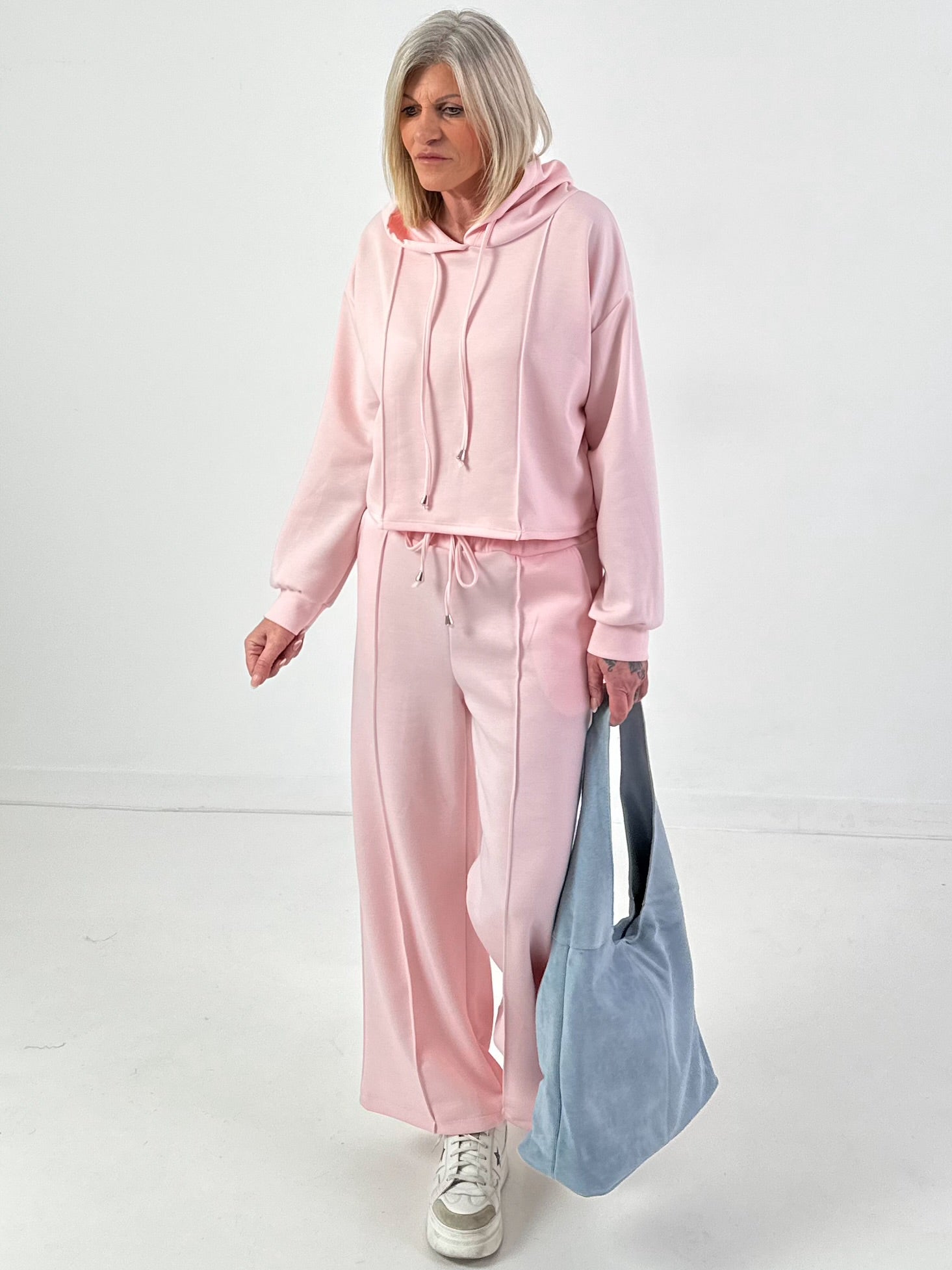 Dieser stilvolle Zweiteiler überzeugt durch seine klare, zeitlose Optik und einen besonders angenehmen Tragekomfort. Das Oberteil ist mit einer Kapuze versehen und wird durch feine Wiesennähte akzentuiert, die dem Look eine moderne und hochwertige Note verleihen. Auch die Hose greift diese Wiesennähte auf und sorgt so für ein harmonisches Gesamtbild.