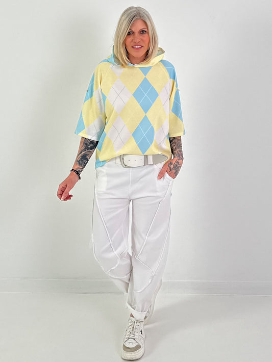 Kurzarm-Hoodie mit Raute - gelb-hellblau-weiss