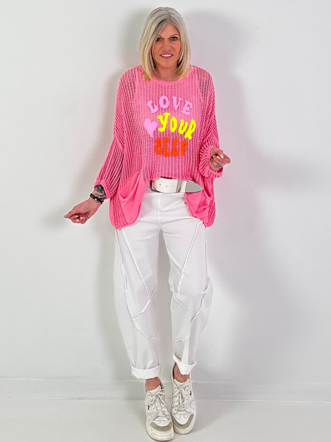 Dieser auffällige Häkelpullover ist ein echtes Statement-Piece für trendbewusste Looks. Das grob gestrickte, luftige Häkel-Design verleiht dem Modell eine moderne, sommerliche Leichtigkeit und sorgt für einen lässigen Oversize-Fall. Der weite Rundhalsausschnitt und die großzügig geschnittenen Fledermausärmel unterstreichen die entspannte Silhouette und bieten hohen Tragekomfort. Auf der Vorderseite setzt der mehrfarbige Statement-Print „Love Your Self“ mit Herzmotiv einen frischen, modischen Akzent und macht den Pullover zum Hingucker. Die locker fallende Passform eignet sich ideal zum Layern über Tops oder Bralettes. Perfekt kombinierbar zu Jeans, Shorts oder Stoffhosen – für stylische Freizeit- und Sommerlooks mit auffälligem Charakter.