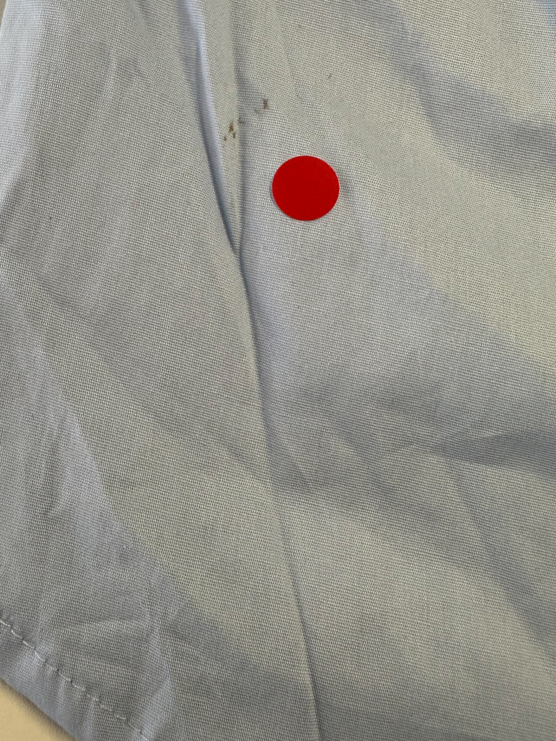 Unterhalb des rechten Vorderteils befindet sich ein Fleck.