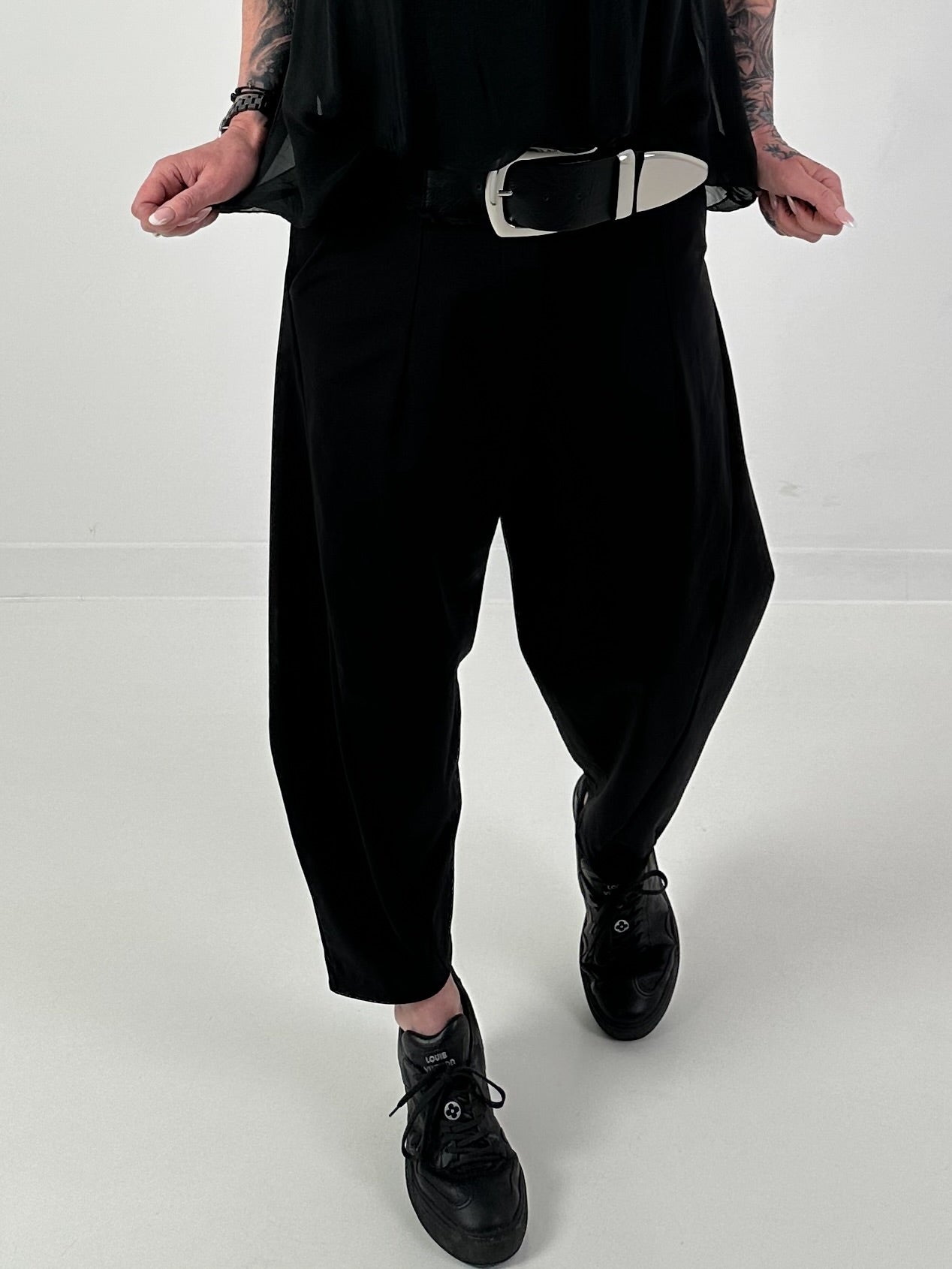 Diese Ballonhose vereint modernen Schnitt mit elegantem Minimalismus. Der formstabile, dennoch angenehm leichte Stoff sorgt für einen schönen Fall und unterstreicht die besondere Silhouette. Typisch für den Ballon-Schnitt verläuft die Hose locker über Hüfte und Oberschenkel und wird zum Beinabschnitt schmaler, wodurch die charakteristische, voluminöse Form entsteht. Der elastische Bund auf der Rückseite bietet zusätzlichen Tragekomfort und passt sich flexibel an. Ein markantes Design-Detail ist die asymmetrisch verlaufende Naht auf der Vorderseite, die der Hose eine moderne, architektonische Linie verleiht und den cleanen Look stilvoll aufbricht. Seitliche Eingriffstaschen ergänzen die Funktionalität, ohne die minimalistische Optik zu stören.