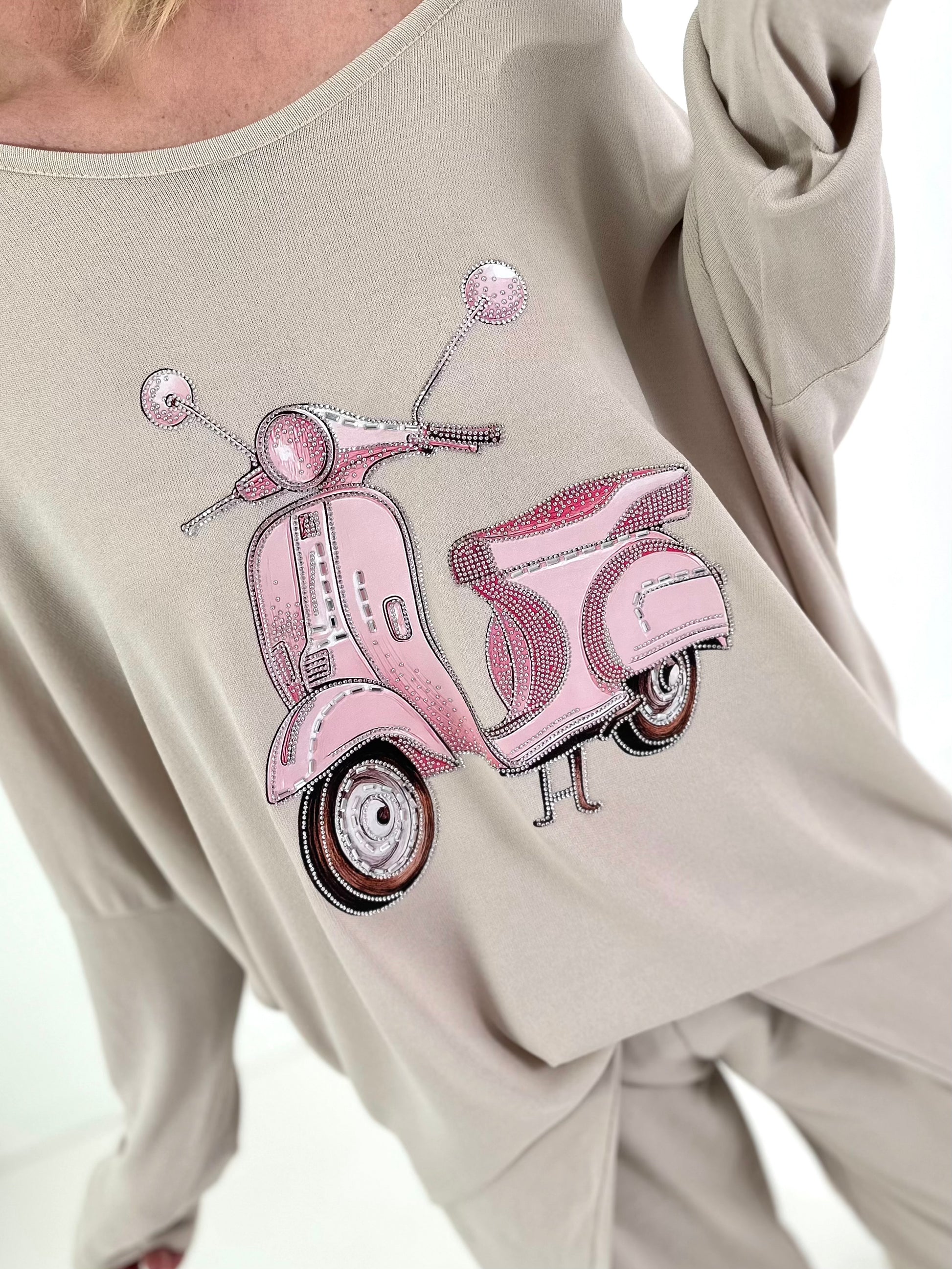 Dieser wunderschöne, leichte Oversize-Pullover begeistert mit einem charmanten Vespa-Motiv auf der Vorderseite, das liebevoll mit zahlreichen funkelnden Glitzersteinchen verziert ist. Das detailreiche Design verleiht dem Pullover einen besonderen, modischen Statement-Charakter und zieht garantiert alle Blicke auf sich. Der lockere Oversize-Schnitt sorgt für eine lässige Silhouette und hohen Tragekomfort, während das leichte Material angenehm weich auf der Haut liegt. Mit seinem femininen Rundhalsausschnitt ist dieser Pullover vielseitig kombinierbar – perfekt zu Jeans, Stoffhosen oder Röcken. Ein echtes Highlight für trendbewusste Looks im Alltag und in der Freizeit.
