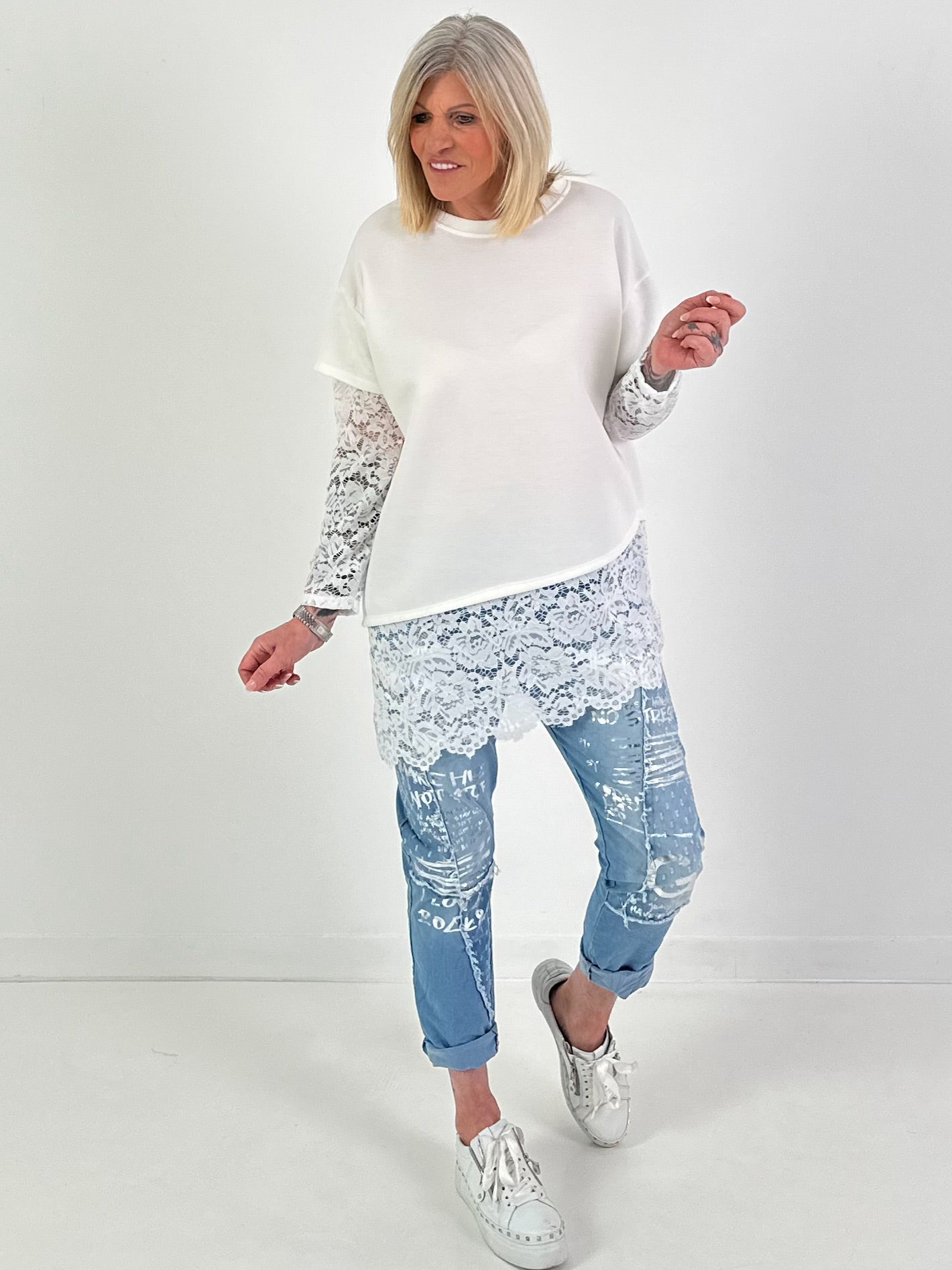 Ein besonderes Highlight sind die langen Ärmel aus feiner Spitze, die dem Sweatshirt eine elegante, leichte Note verleihen. Der leicht asymmetrische Saum mit Spitzeneinsatz sorgt für eine moderne Silhouette und macht das Design zu einem echten Hingucker. Die Kombination aus Sweatmaterial und Spitze schafft einen stilvollen Kontrast zwischen lässig und edel.