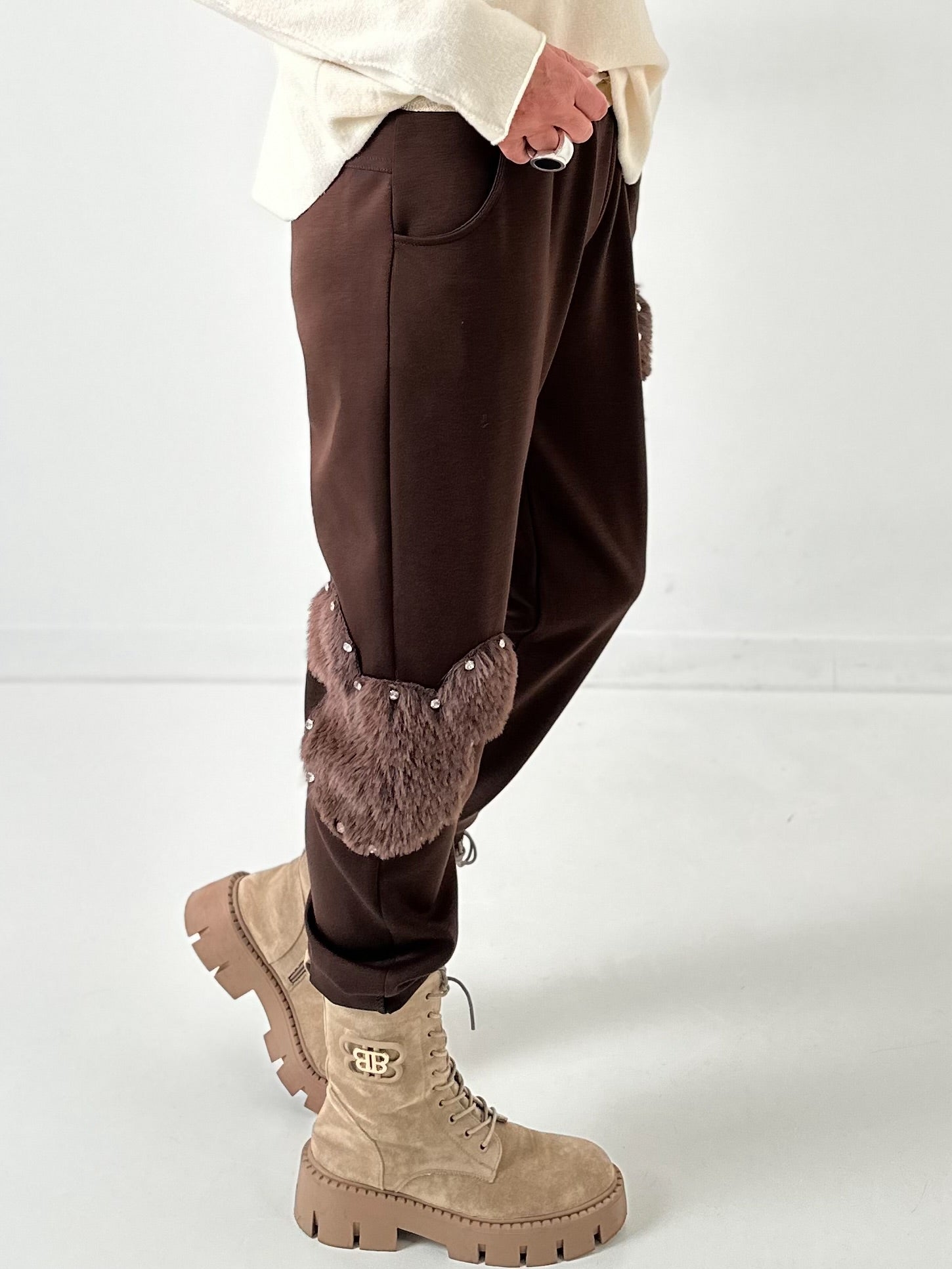 A special highlight are the fluffy, sweet sewn-on appliqués of a beloved actor with large, sparkling riveted gemstones that run along the sides of the front and back, giving the pants a unique eye-catching effect.