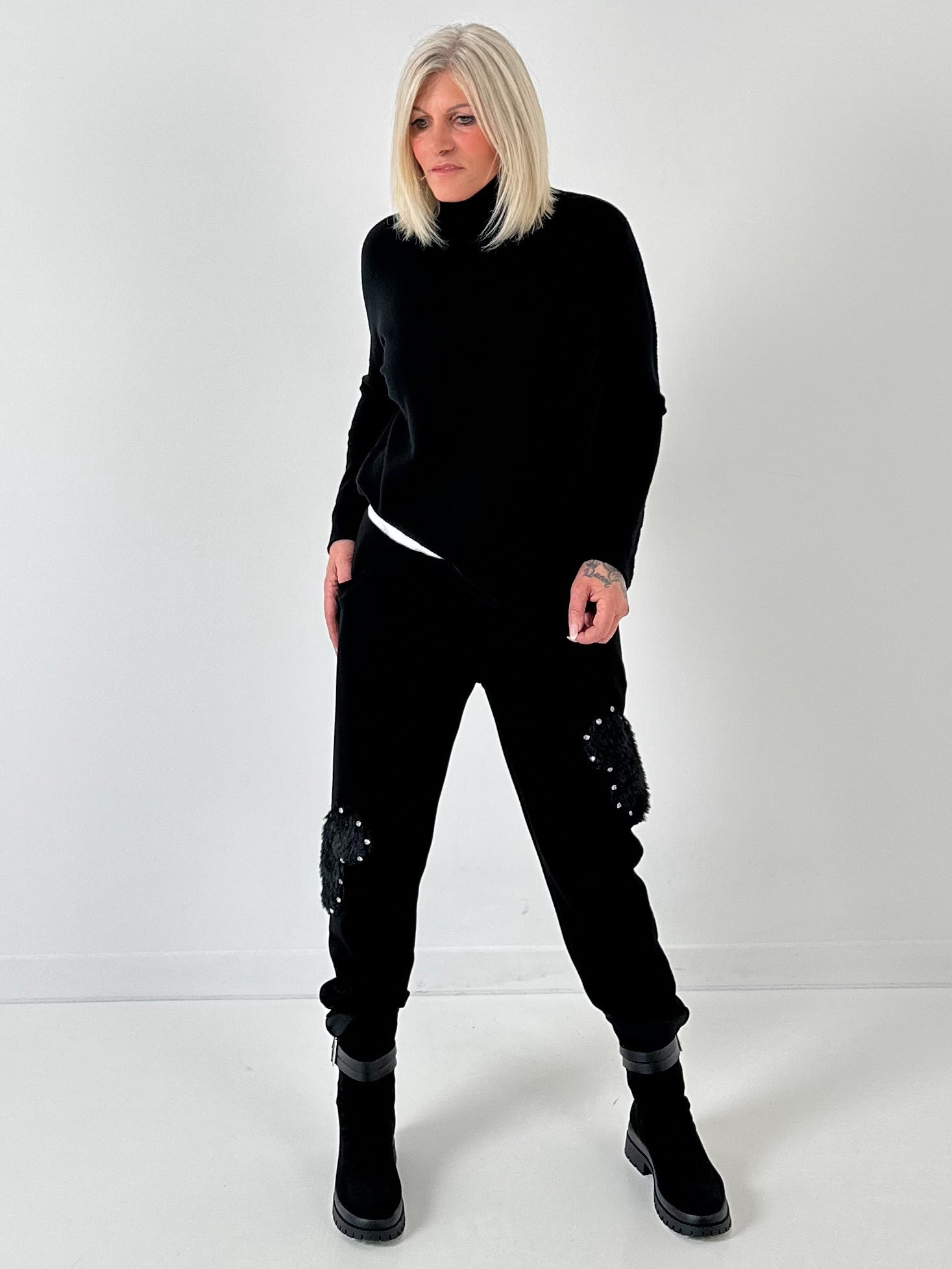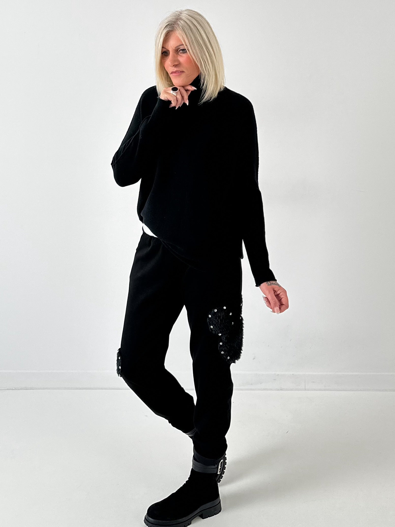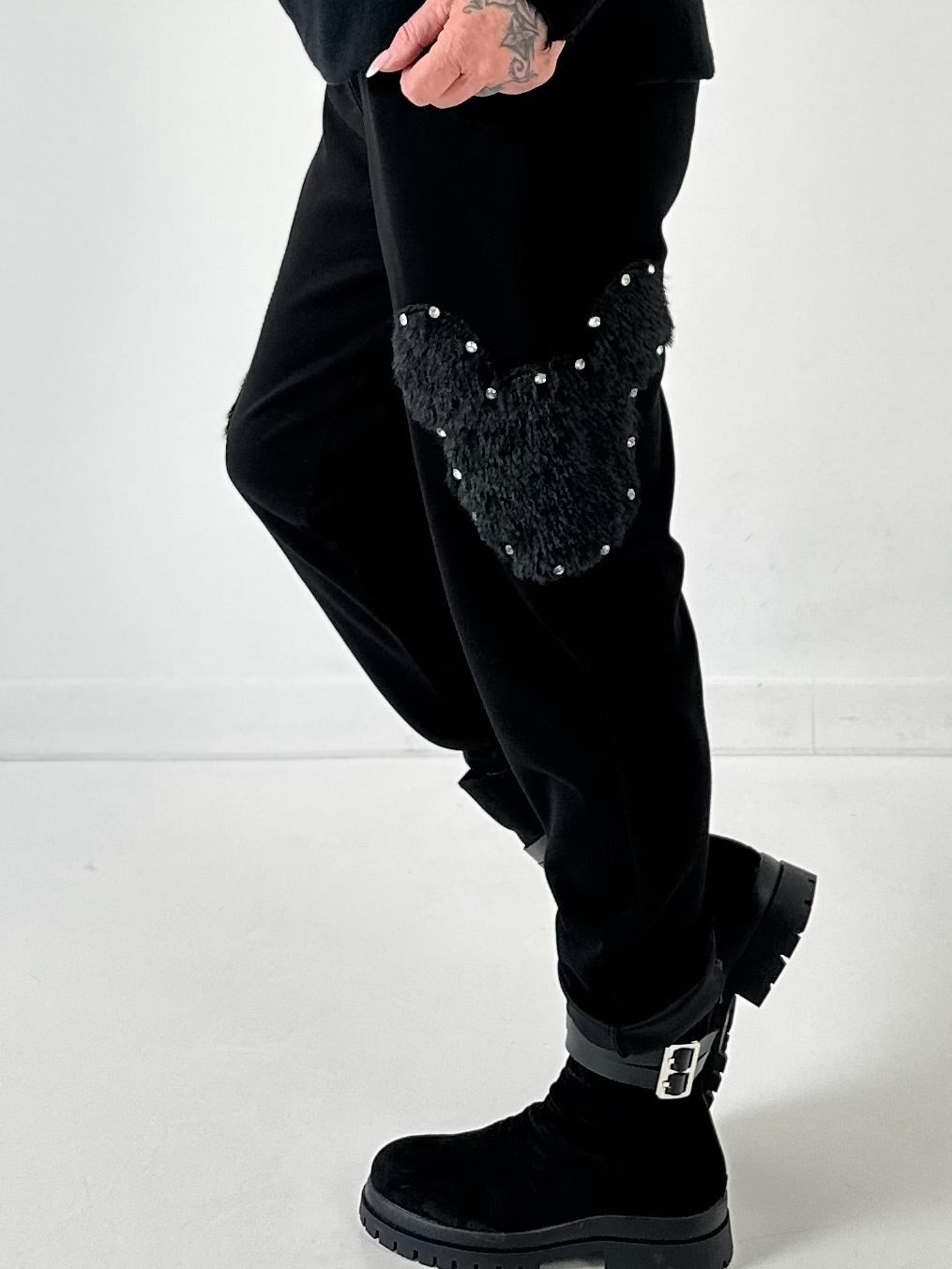 A special highlight are the fluffy, sweet sewn-on appliqués of a beloved actor with large, sparkling riveted gemstones that run along the sides of the front and back, giving the pants a unique eye-catching effect.