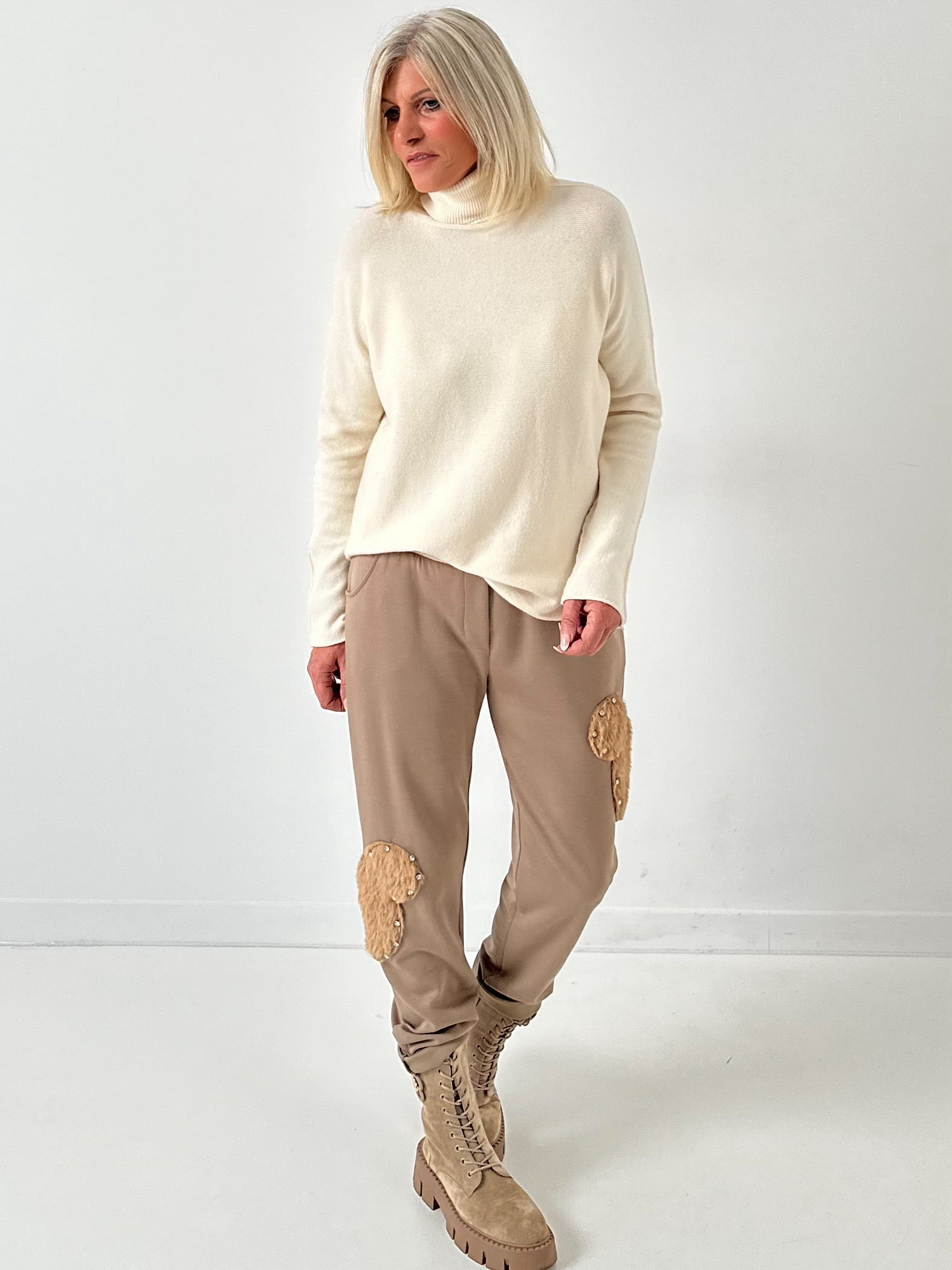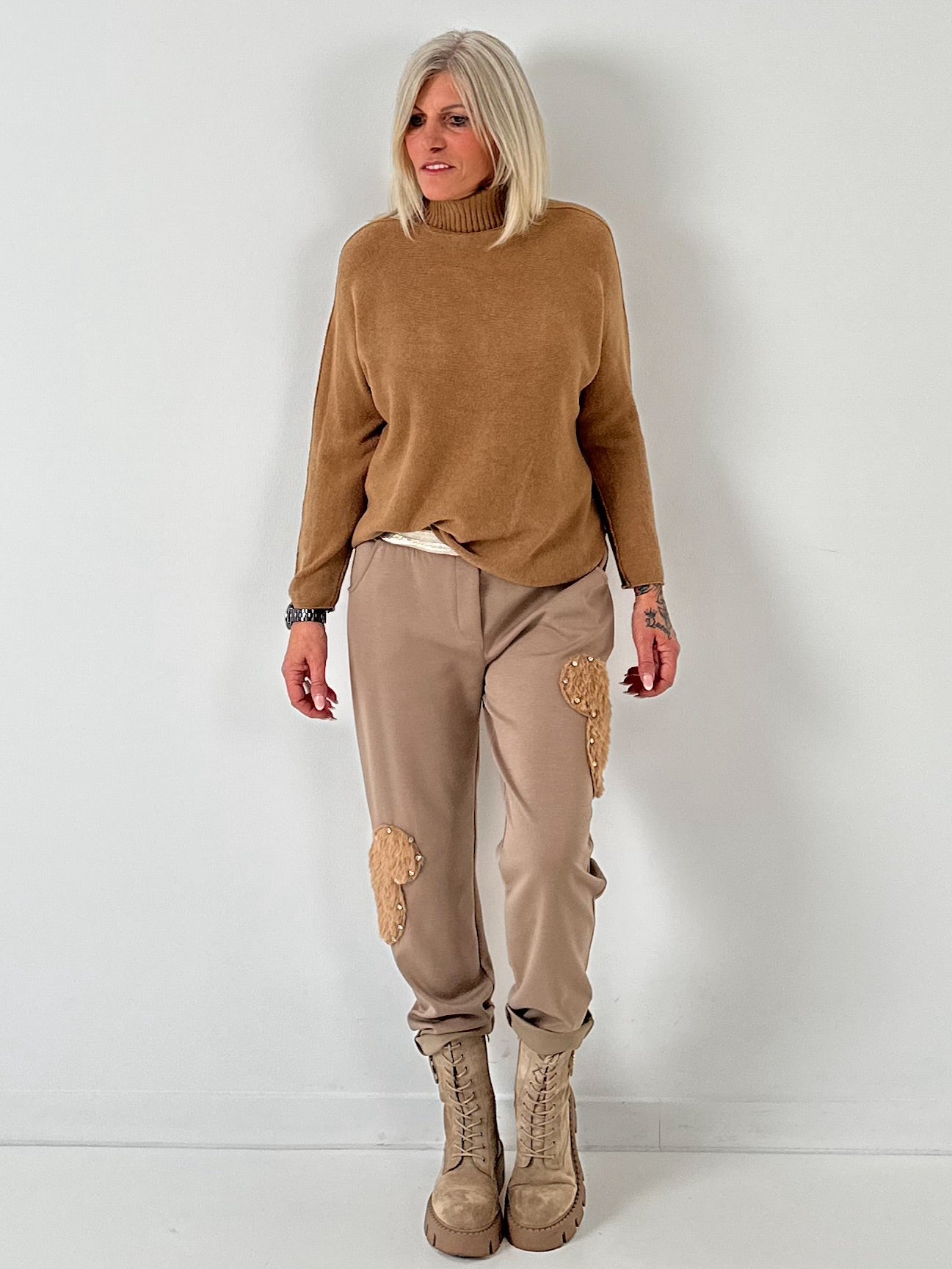 A special highlight are the fluffy, sweet sewn-on appliqués of a beloved actor with large, sparkling riveted gemstones that run along the sides of the front and back, giving the pants a unique eye-catching effect.