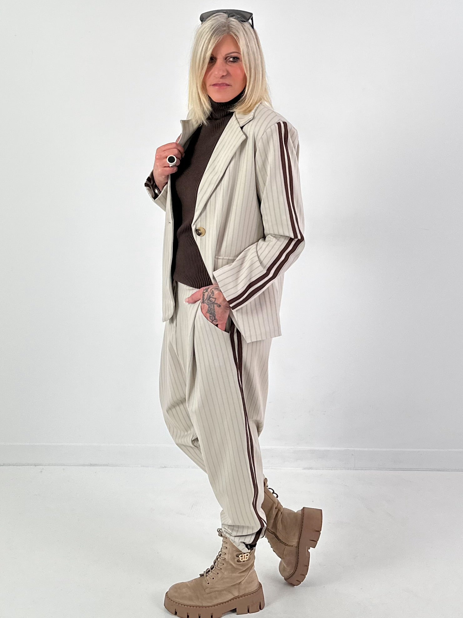 The Office Out trousers combine classic chic with a sporty twist. Crafted from pinstriped stretch fabric, they feature contrasting side stripes that lend the look a modern dynamism. Pleats and side pockets add an elegant touch, while the elasticated waistband offers maximum comfort. A stylish companion that looks great both in the office and at leisure – and harmonizes perfectly with the Office Out blazer.