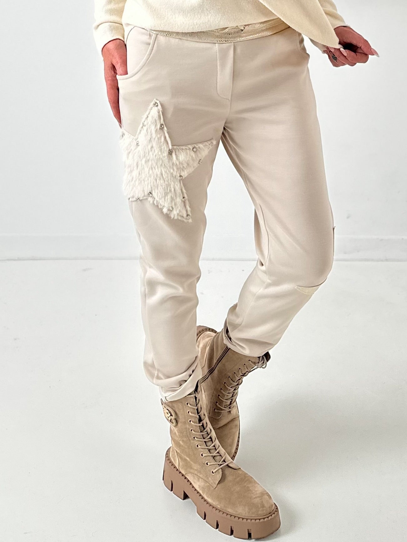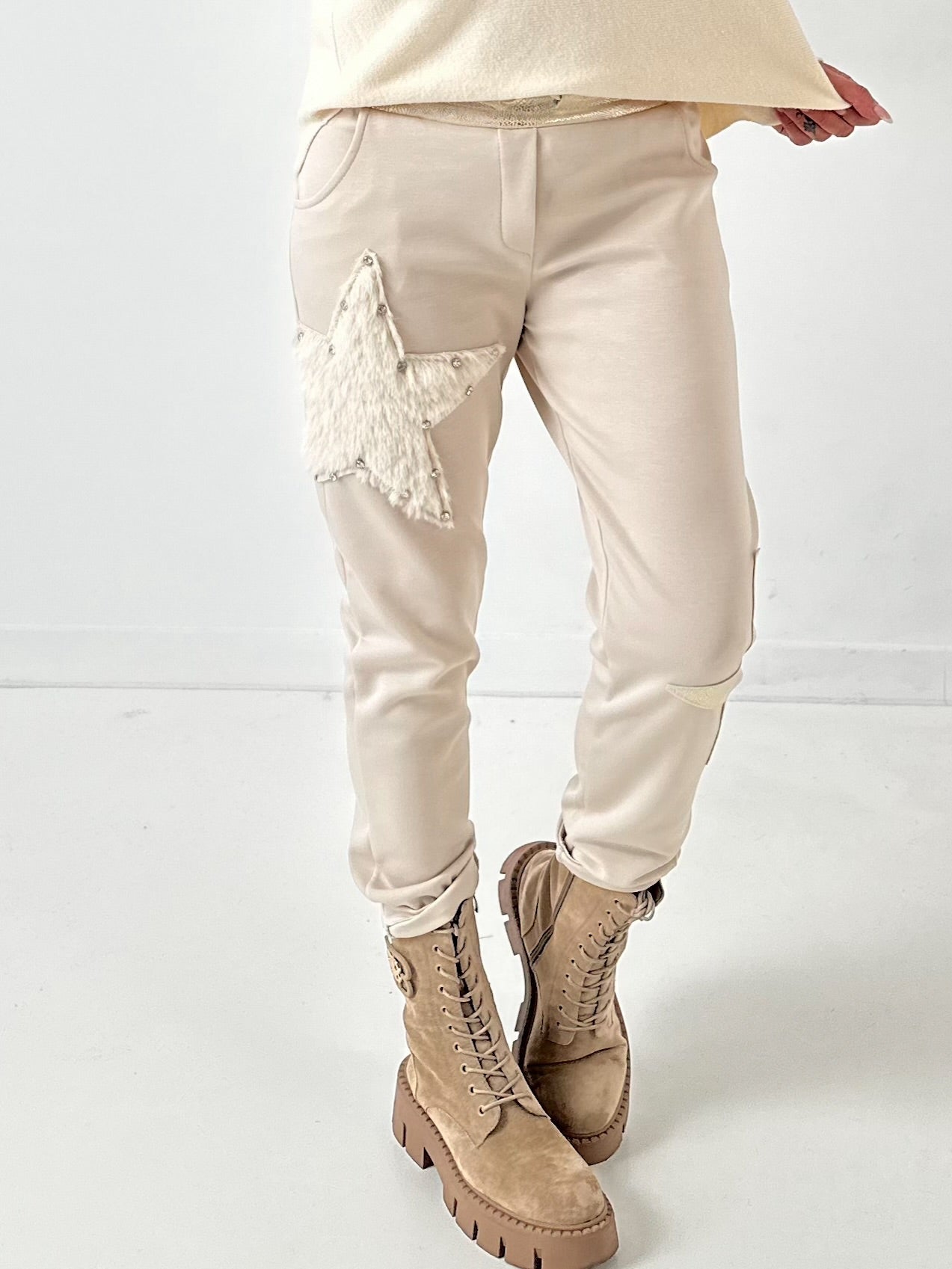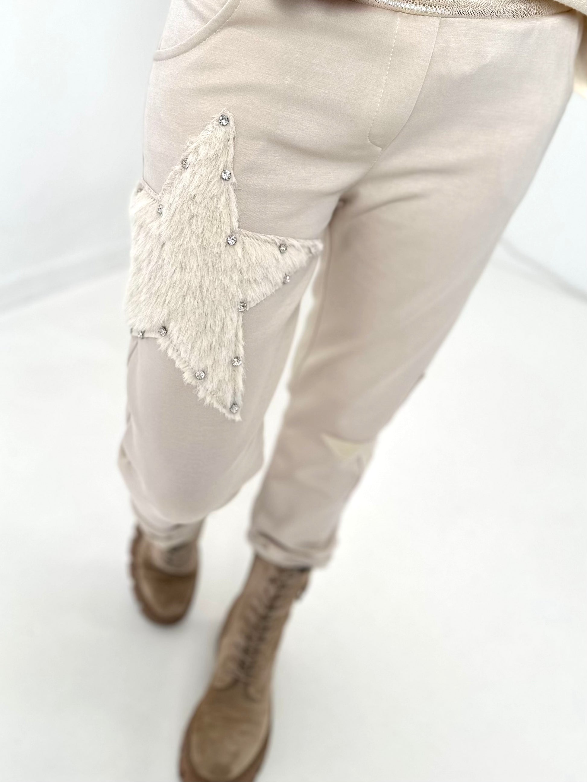 A half sparkling glitter star as a sewn-on appliqué on the left leg and a fluffy star with large, shimmering riveted gemstones on the right leg add special highlights and make the trousers a real eye-catcher.