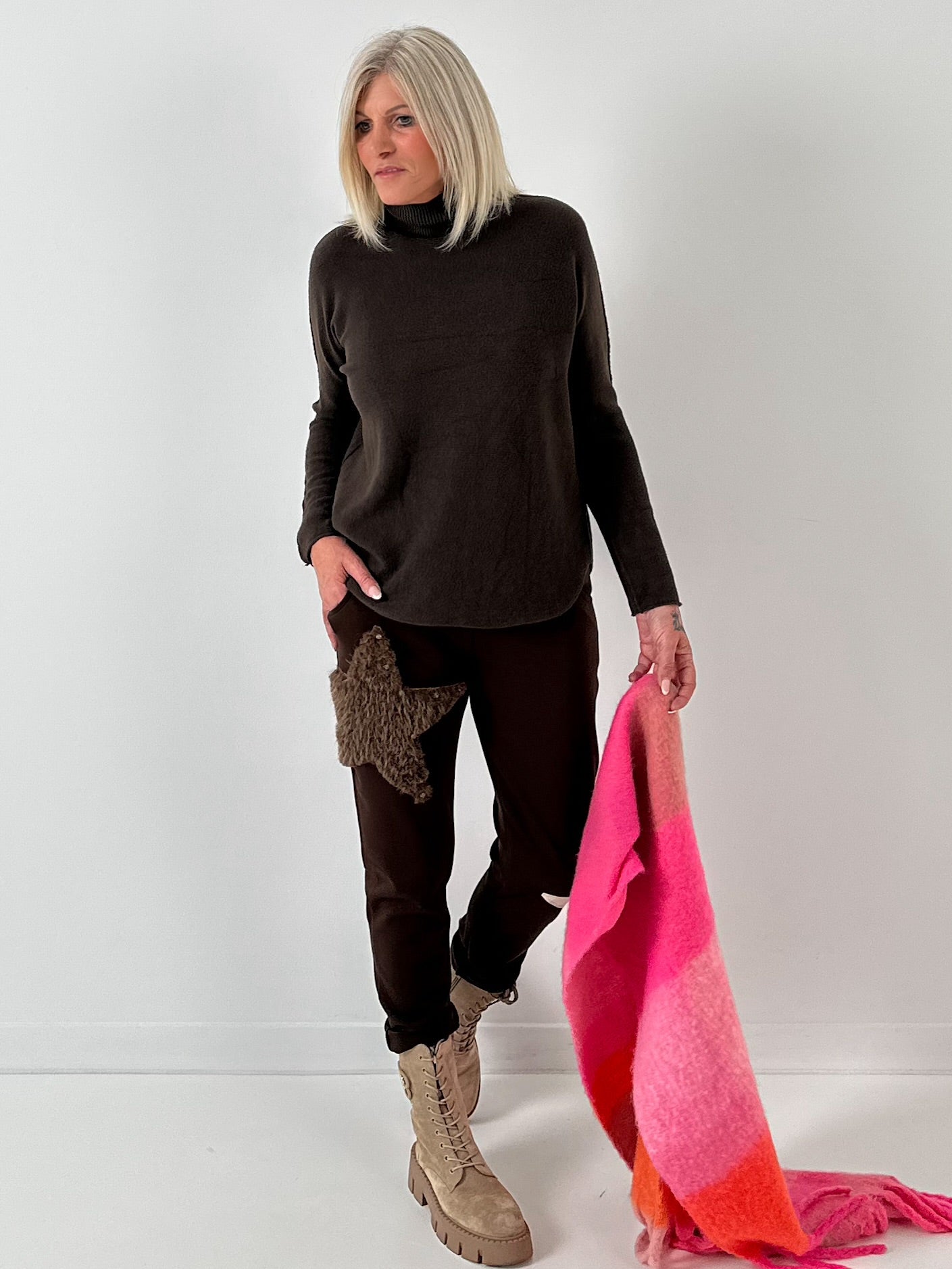 A half sparkling glitter star as a sewn-on appliqué on the left leg and a fluffy star with large, shimmering riveted gemstones on the right leg add special highlights and make the trousers a real eye-catcher.