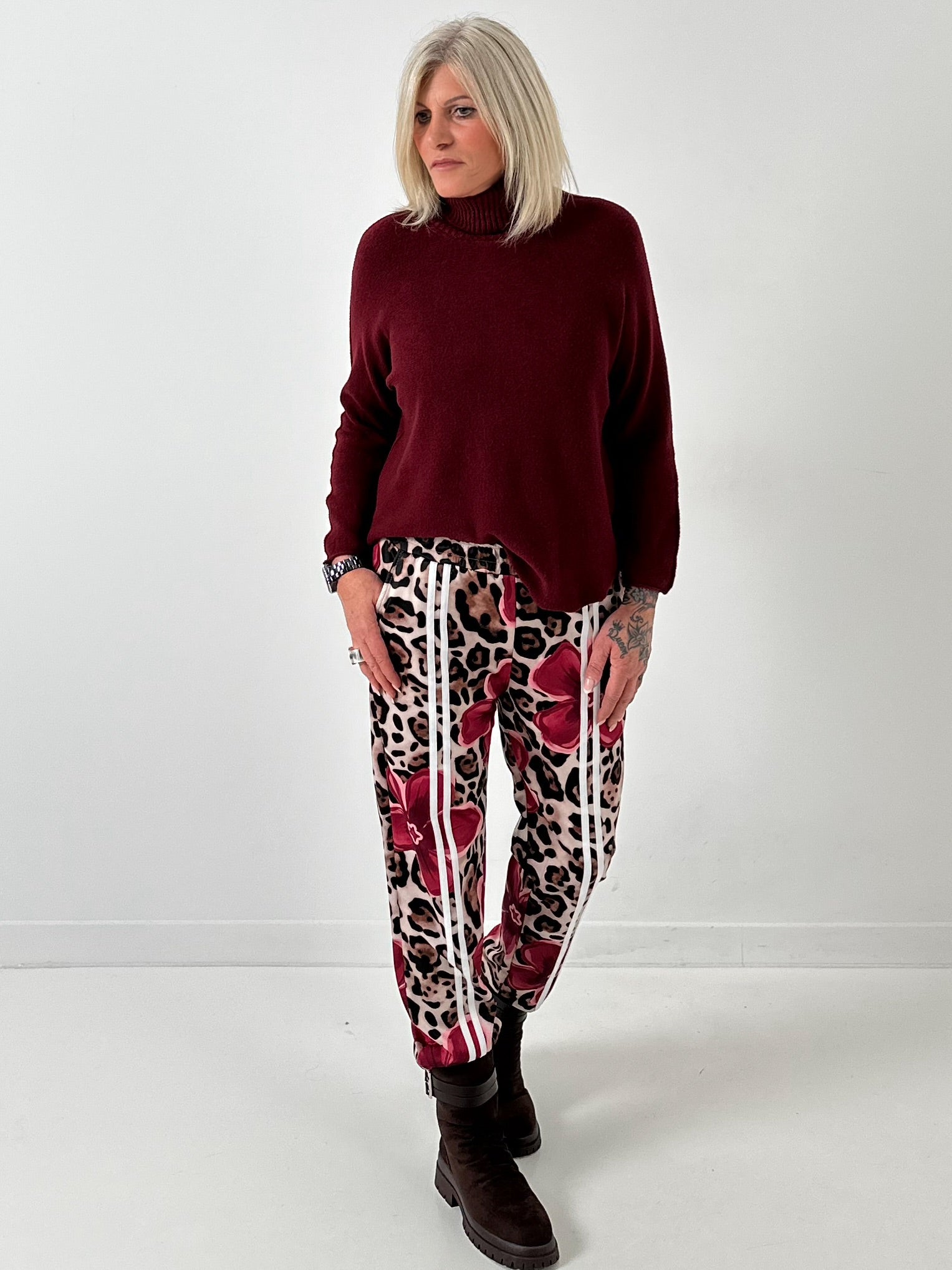 Make a fashion statement with these eye-catching pants that combine comfort and style. The unique design combines a trendy leopard print with large, elegant flowers. The white stripes on the front add a sporty touch and visually lengthen the look. The elastic waistband adapts perfectly to your figure and guarantees a comfortable fit all day long. The soft material makes these pants the ideal companion.
