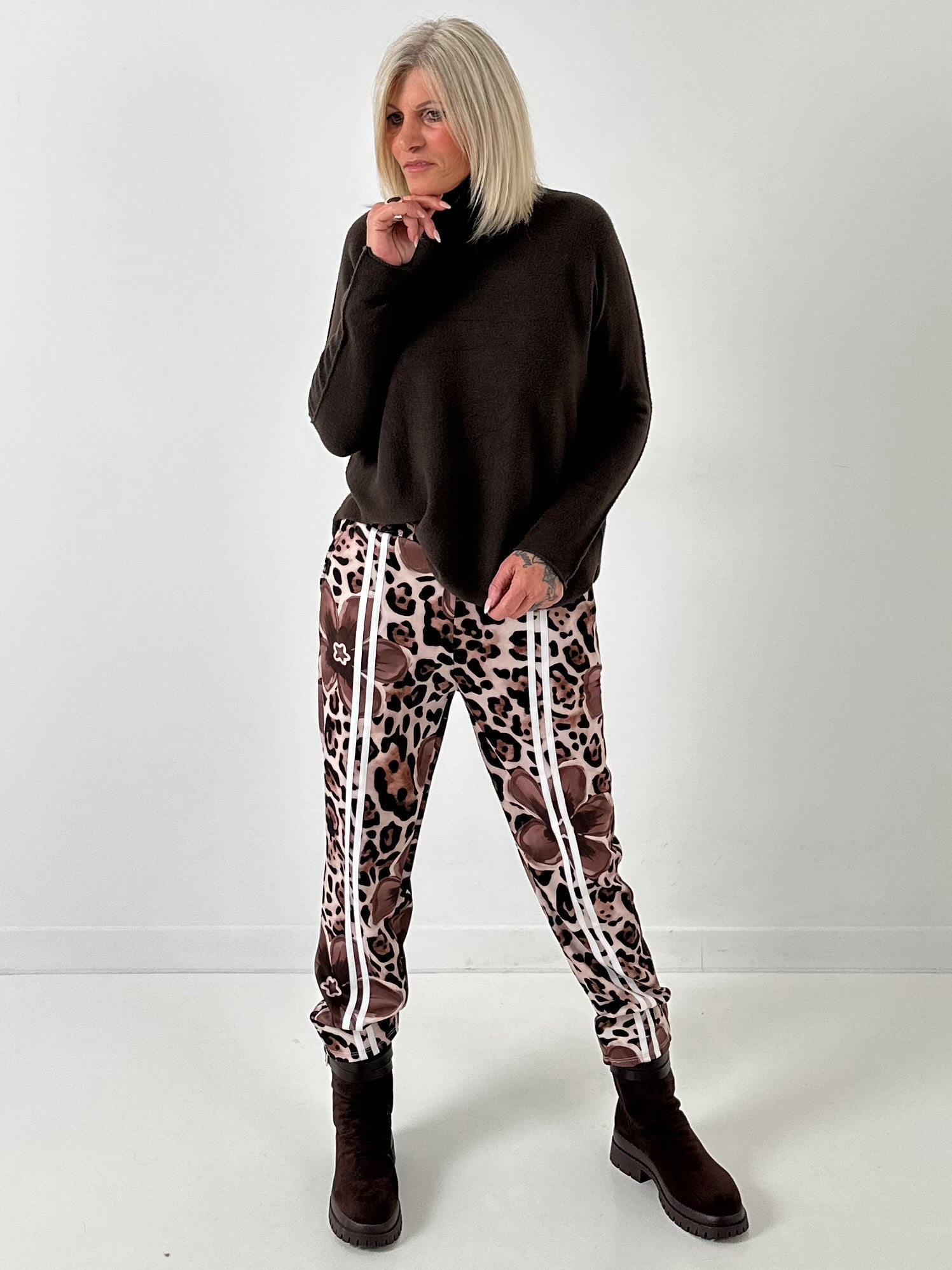 Make a fashion statement with these eye-catching pants that combine comfort and style. The unique design combines a trendy leopard print with large, elegant flowers. The white stripes on the front add a sporty touch and visually lengthen the look. The elastic waistband adapts perfectly to your figure and guarantees a comfortable fit all day long. The soft material makes these pants the ideal companion.
