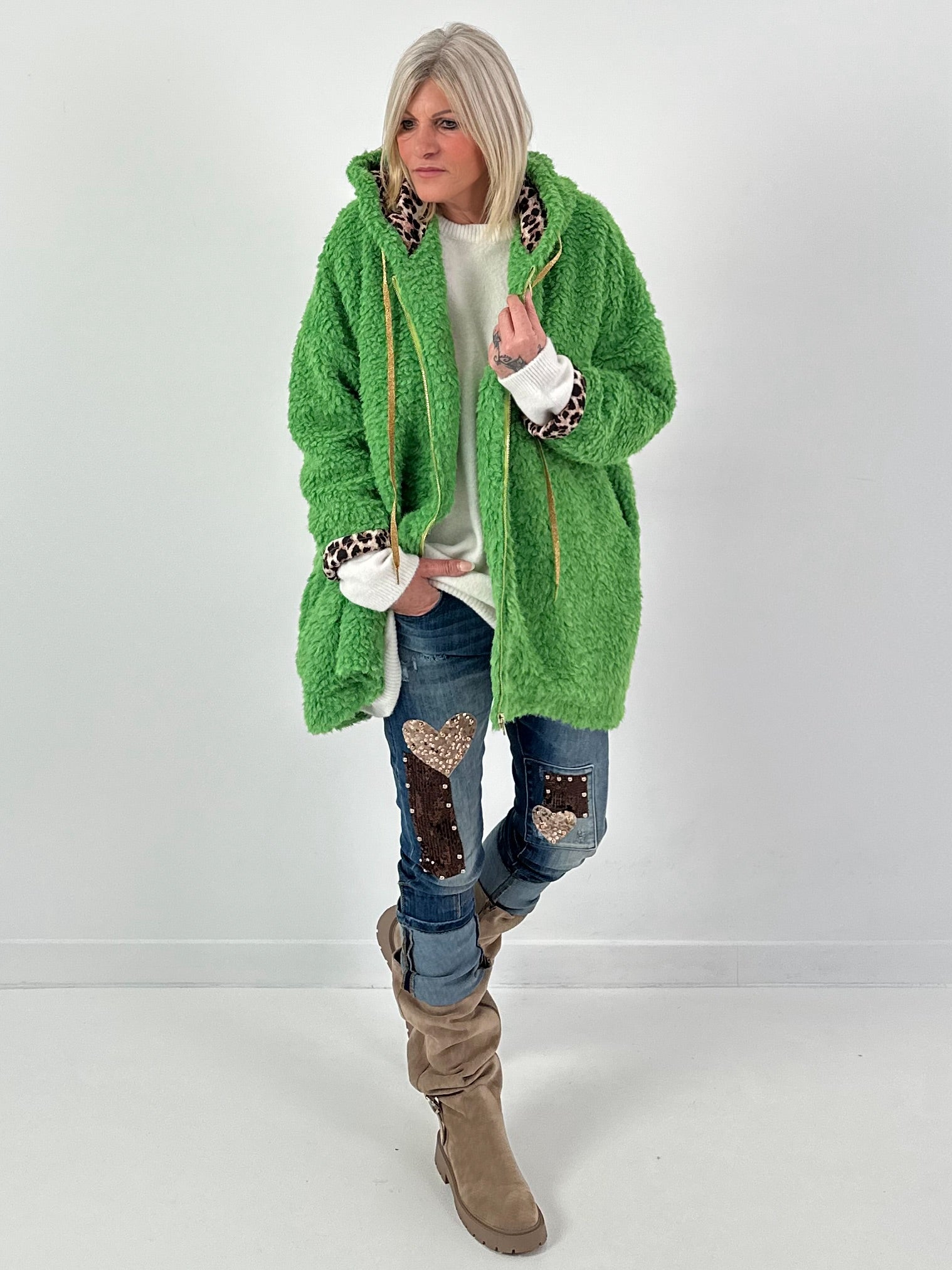 Denim Heartbeat combines coolness with charm, featuring dark denim in a distressed wash, embellished with loving details. Sequin patches in beige and mocha tones, some edged with studs, add sparkling accents, while denim patches and subtle distressed elements lend the look a casual feel. Two side pockets, two back pockets, and a button and zip closure make them perfect for everyday wear. Jeans that sparkle without being over the top and show heart where otherwise there would only be denim.