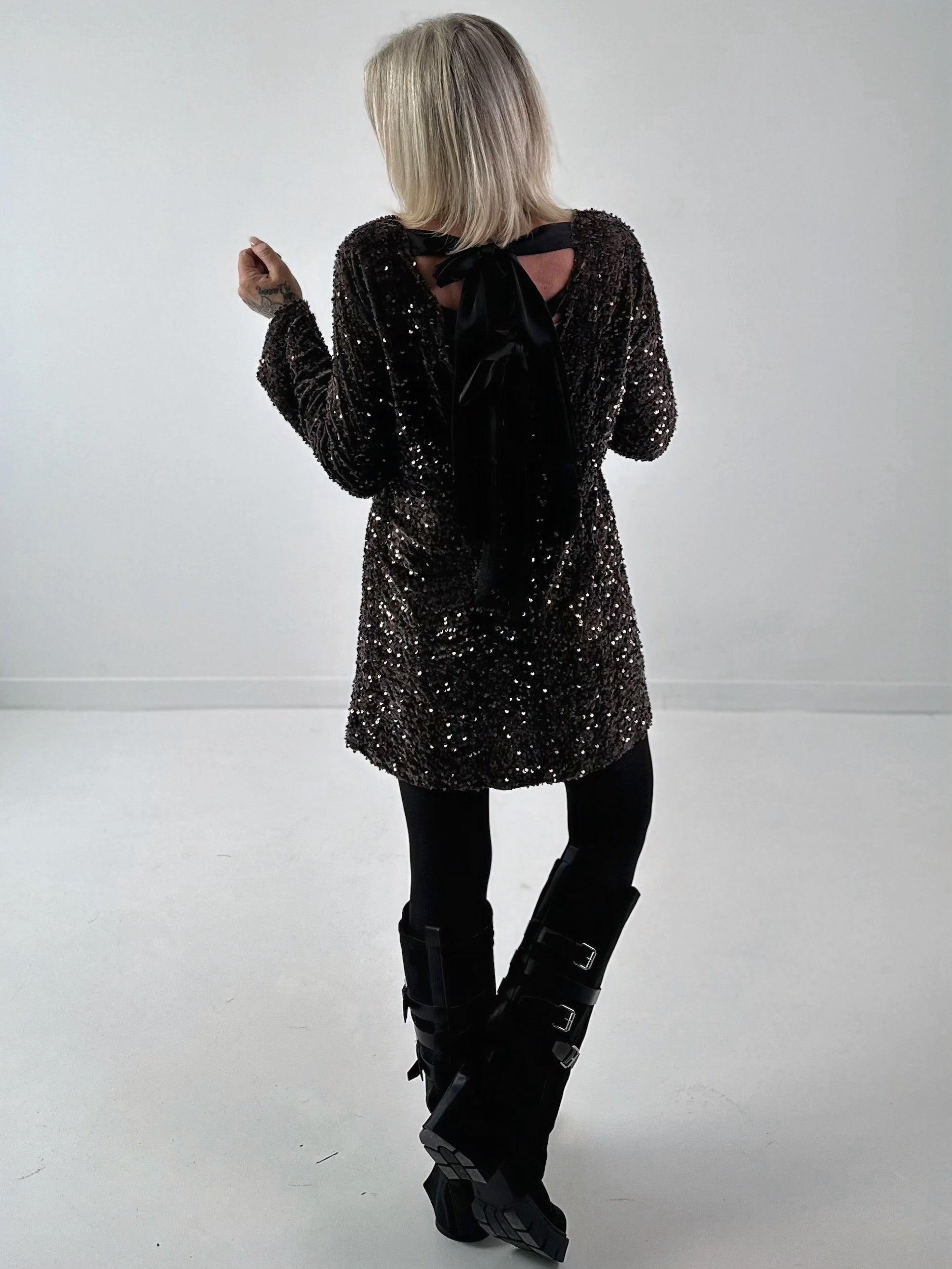 This mini dress is a prime example of timeless glamour. Covered entirely in sparkling sequins, it makes every movement shine. While the front exudes elegance with its clean lines, the back surprises with a deep V-back tied by two elegant bows – a sophisticated detail that perfectly blends femininity and playfulness. Short, shimmering, and elegant – a dress that will be the radiant center of attention at any occasion.