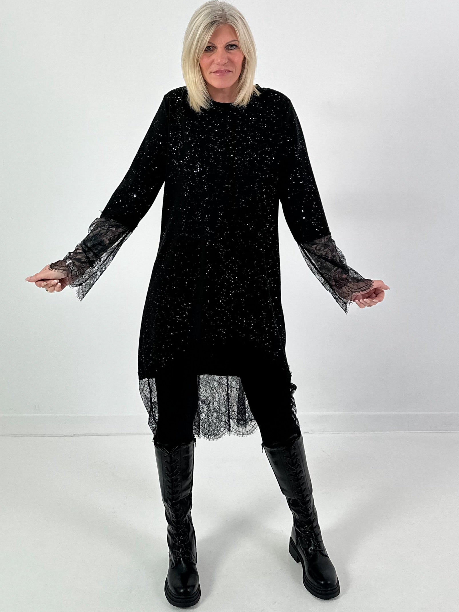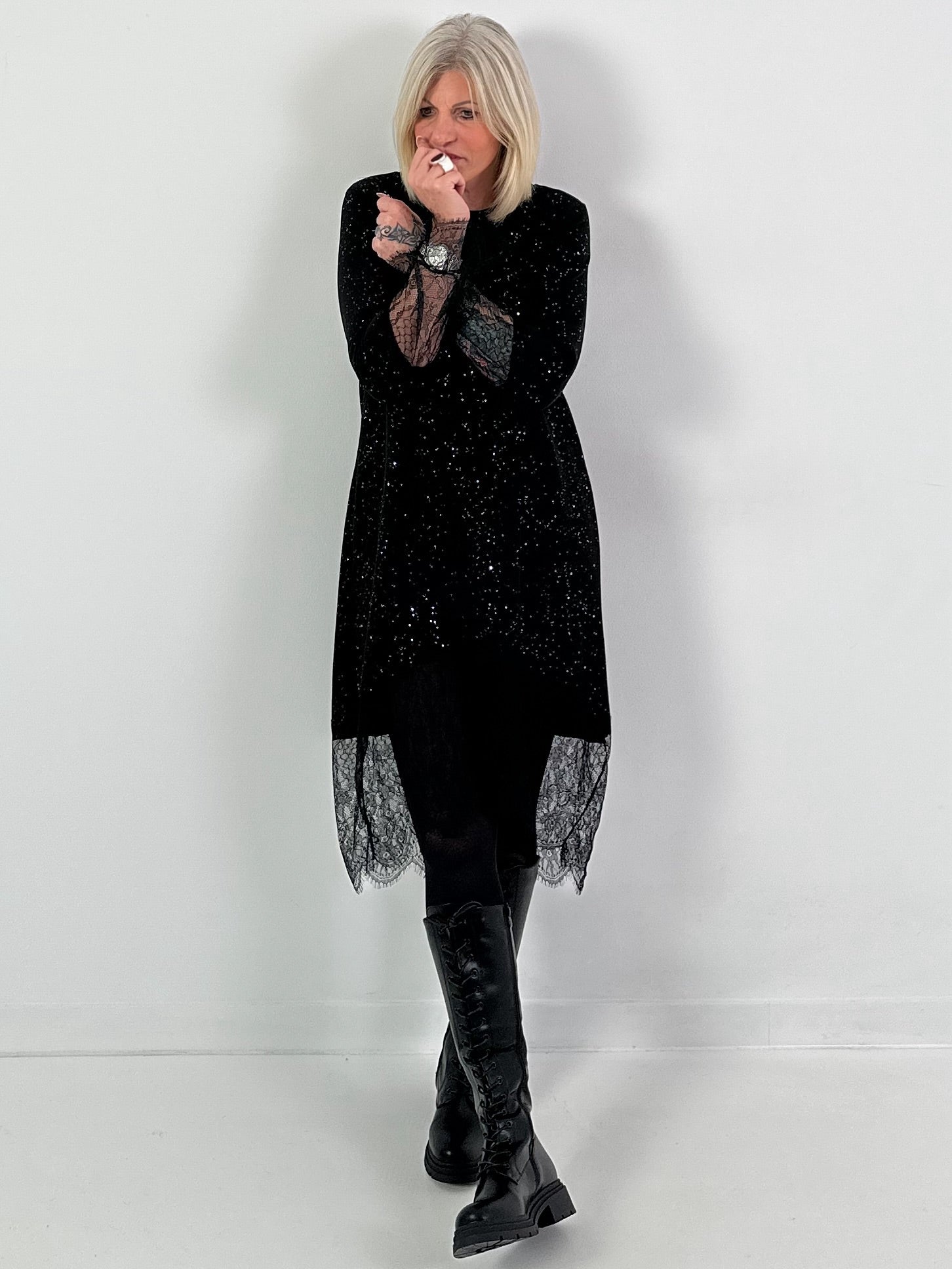 A dress that captures the night sky: delicate silver shimmering elements spread across the fabric like stars, changing with every movement. The round neckline and the subtle lace inserts on the sleeves and hem add an elegant touch. Light, sophisticated, mysterious – Universe You is made for nights that will be unforgettable.