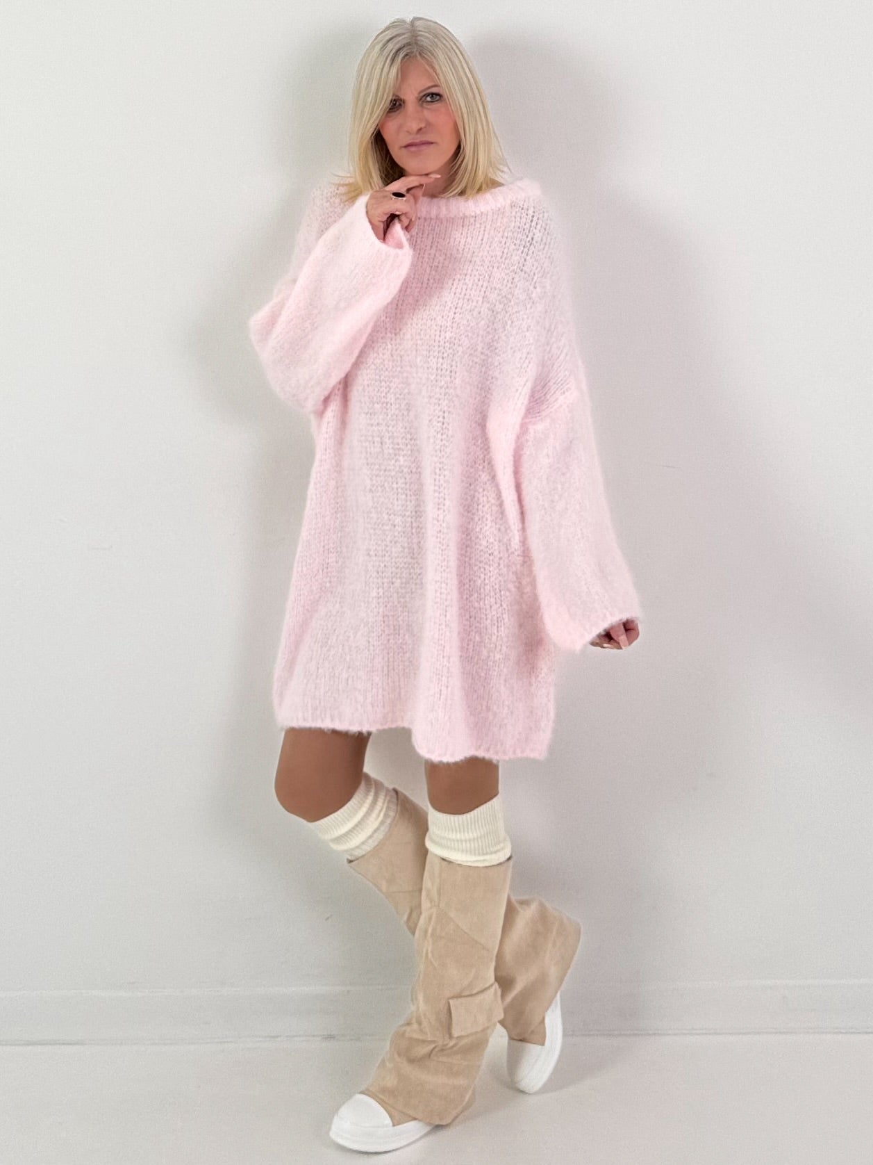 This dreamily soft long sweater/dress is the epitome of cozy elegance. The fluffy knit in delicate pink envelops you like a warm embrace and lends your look a feminine, gentle touch. Its generous length allows it to be worn as a classic oversized sweater or a relaxed dress – perfect for cozy days at home or stylish streetwear outfits.
