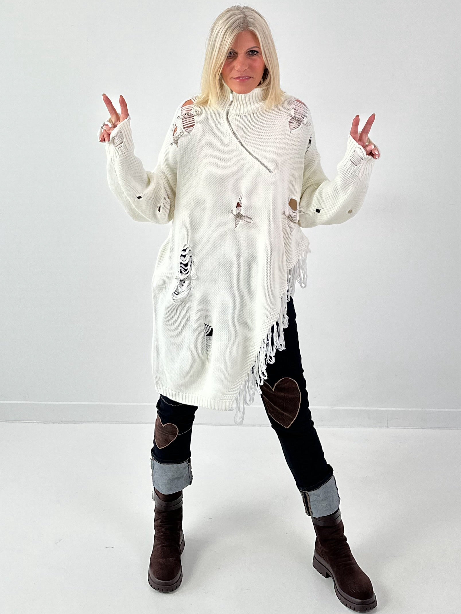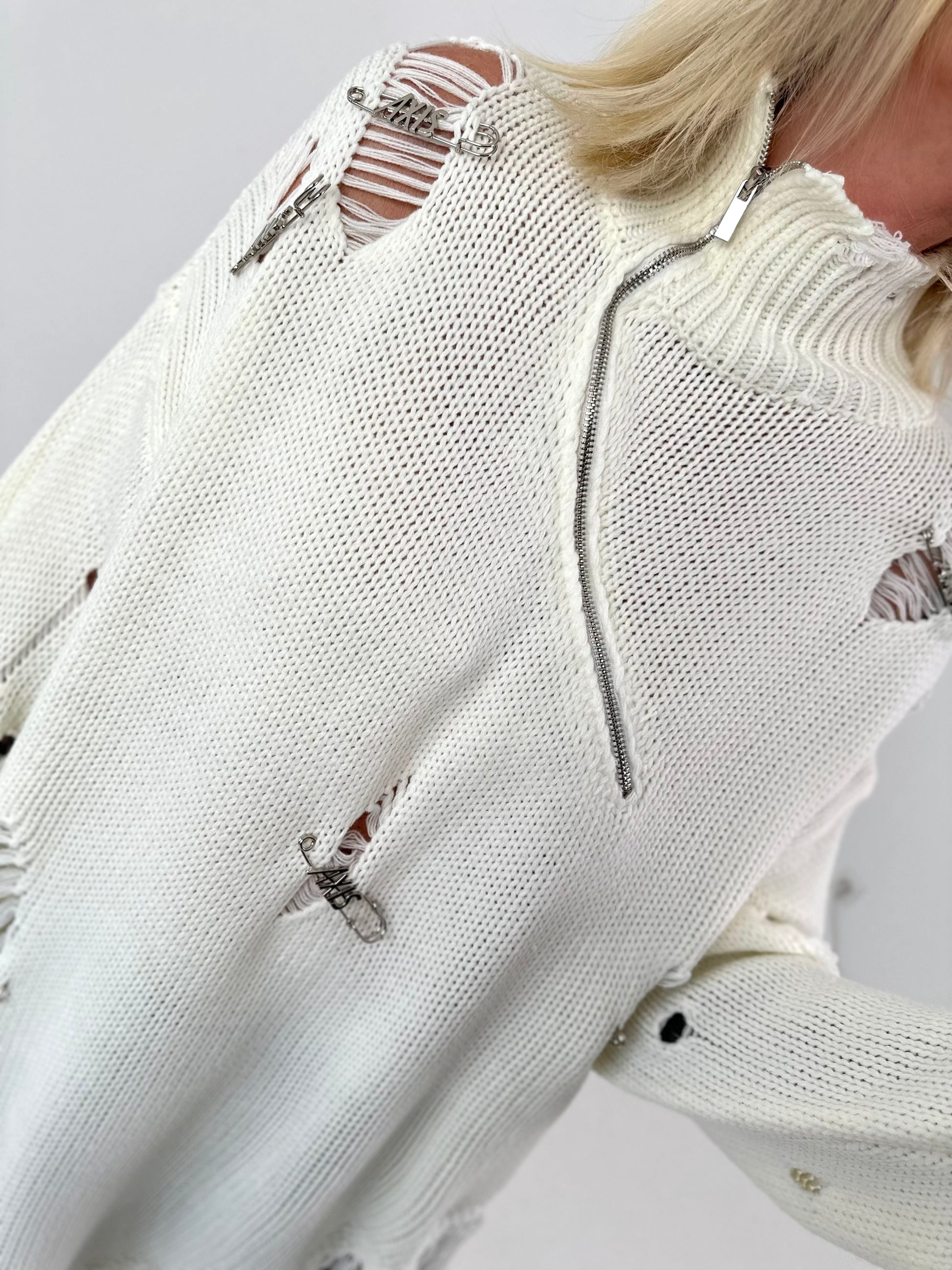 This sweater makes an uncompromisingly bold fashion statement. Asymmetrically cut with a longer hem on the right and a shorter one on the left, it deliberately plays with contrasts and extremes. Fringes, striking distressed details, and a diagonal zipper running from the collar enhance its rebellious character. Silver pins with the AXIS logo echo the tough style and give the knit a distinctive finish. A piece for those who understand fashion as an expression of individuality.